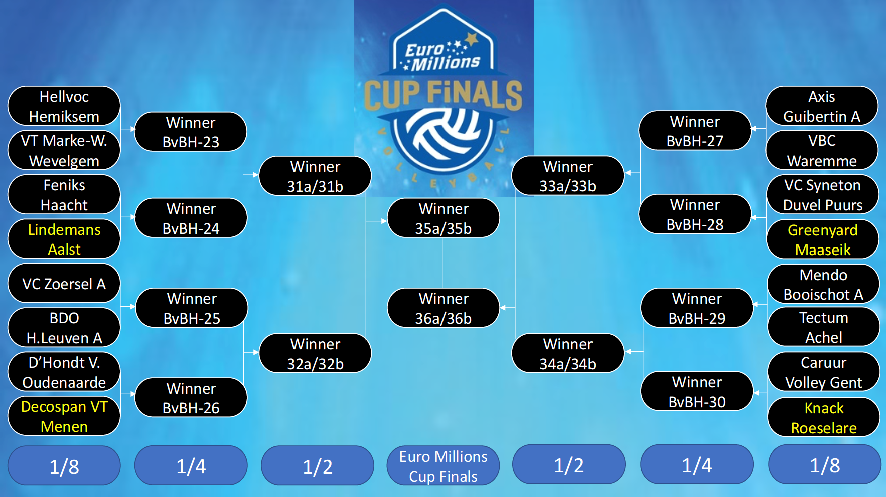 De kwartfinales in het toernooi om de Beker van België zijn gespeeld en de top 4 van de ranglijst heeft vrij eenvoudig de volgende ronde bereikt. De huidige leider van de ranglijst, Maaseik met Just Dronkers en Jelte Maan, won van VC Syneton (Liga B) uit Puurs (13-25, 21-25, 14-25). In de volgende ronde spelen ze tegen VBC Waremme. Deze ronde wordt de komende twee weken over een uit- en een thuiswedstrijd beslist.