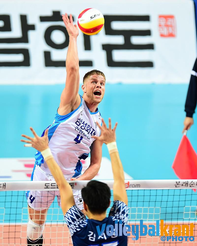 Een verbeten blik van Sloetjes na een aanval. En Robin de Kruijf blokkeert.