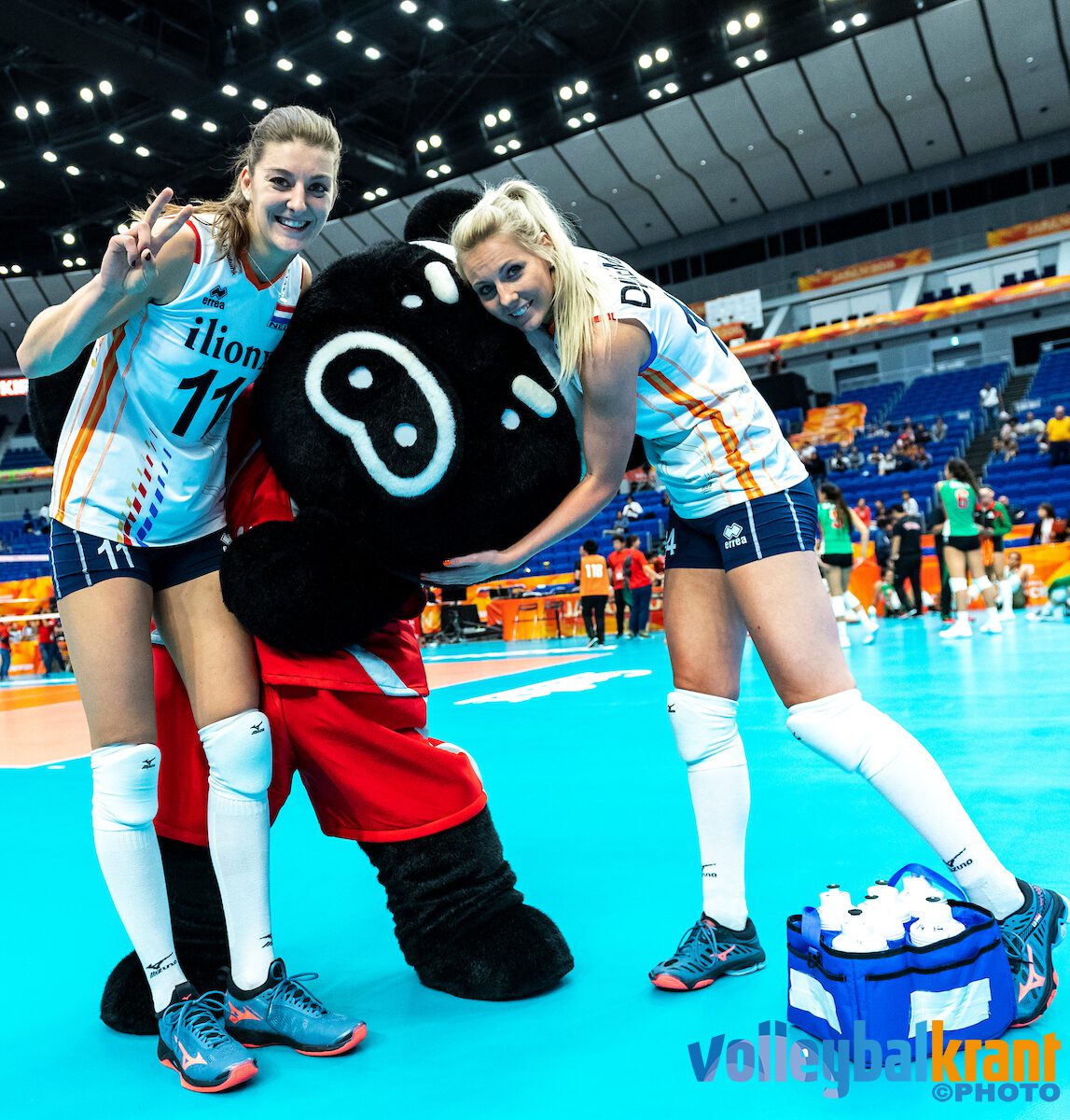 Laura Dijkema en Anne Buijs vieren de overwinning op Mexico
