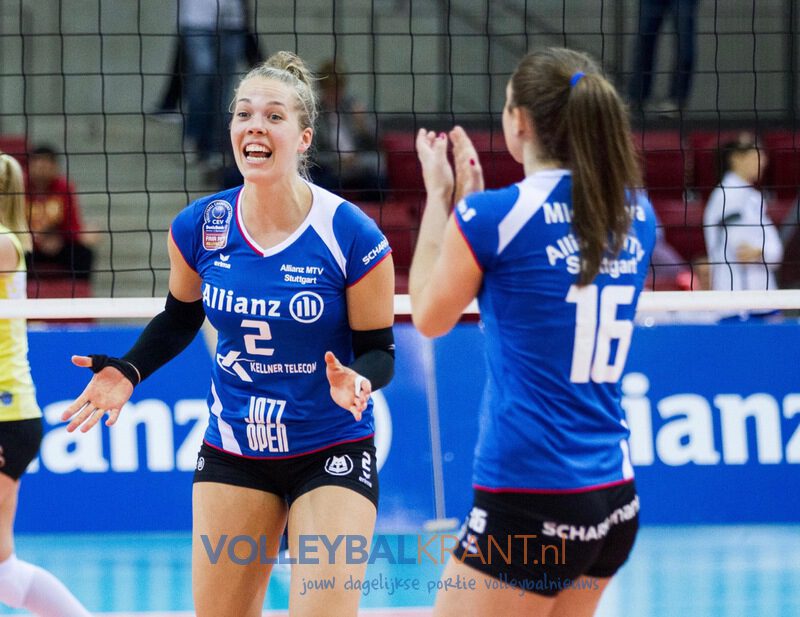 De thuisploeg van spelverdeelster Britt Bongaerts leek in die eerste doorgang bij 19-24 voor een verloren zaak te strijden tegen het favoriete Stuttgart van oud-Aachen speelster Femke Stoltenborg en haar Nederlandse collega’s Kim Renkema en Deborah van Daelen, die allen in de basis begonnen. Maar voor een uitzinnig thuispubliek overleefde Aachen deze 5 setpoints en won na een meer dan een half uur durend gevecht de set met 31-29(!). Daarmee had Aachen echter zoveel energie verspild dat Stuttgart daarna aan de kleine tempoversnelling genoeg had om uiteindelijk toch met een 3-1 zege en de volle mep punten naar huis te gaan.
