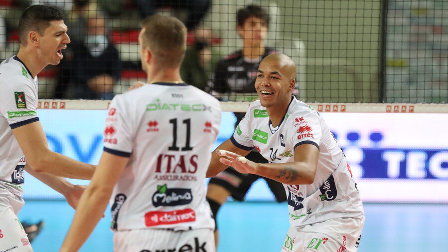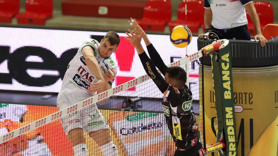 Servicegeweld Trentino Volley ging op bezoek bij Padova, wat het seizoen goed is begonnen door zich te kwalificeren voor de kwartfinale van de beker. Trento mistte vorige week op een haar na de finale van de Supercup, maar liet zien in goede vorm te steken. Zondag tegen Padova was ook de Braziliaanse Lucarelli eindelijk inzetbaar, dus was Trento aan haar stand verplicht te winnen. Padova verkocht de huid echter duur, waardoor het lange tijd een voorsprong had in set één. Toch kroop Trento langszij en op een stand van 25-26 maakte Dick Kooy een prachtig killblock, wat setwinst betekende. Set twee ging mede door de servicedruk van onze Nimir Abdelaziz gemakkelijk naar Trento (15-25). Set drie ging weer gelijk op, met Padova dat dit keer vanaf de servicelijn voor aces wist te zorgen. Trento bleef wel steeds aan de goede kant van de score en op 24-25 kwam Nimir Abdelaziz, die ondertussen al 9(!) aces achter zijn naam had, aan serve en hij zorgde voor de beslissing. De enorme klap was oncontroleerbaar voor Padova, waardoor de bal niet over het net kwam. Zo pakte Trento mede dankzij onze Nederlanders de volle punten. Naast de bijzondere wedstrijd van Abdelaziz was ook de prestatie van Kooy uitstekend. Hij scoorde 12 punten (73% aanval, drie blocks en een ace). Abdelaziz kwam mede door zijn negen aces op een totaal van 22 punten (58% aanval en nog twee blocks).