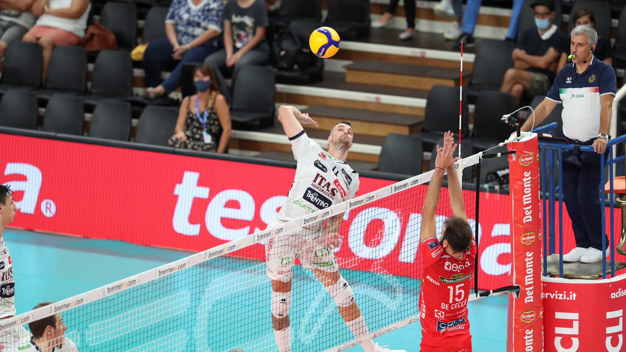 De allereerste officiële wedstrijd in het shirt van Trento was een mooie voor Abdelaziz en Kooy. Hun team moest het (nog) doen zonder middenman Lisinac en pass/loper Lucarelli (zijn vader overleed onlangs). Ondanks het gemis van twee basisspelers wist Trento de heenwedstrijd met 3-2 winnend af te sluiten. En onze Nederlanders waren absolute hoofdrolspelers. Nimir Abdelaziz werd topscorer van de wedstrijd met 23 punten (38% aanval, vier aces en vier blocks!). Ook Dick Kooy was serverend en aanvallend ijzersterk, hij noteerde 18 punten (50% aanval en vier aces).