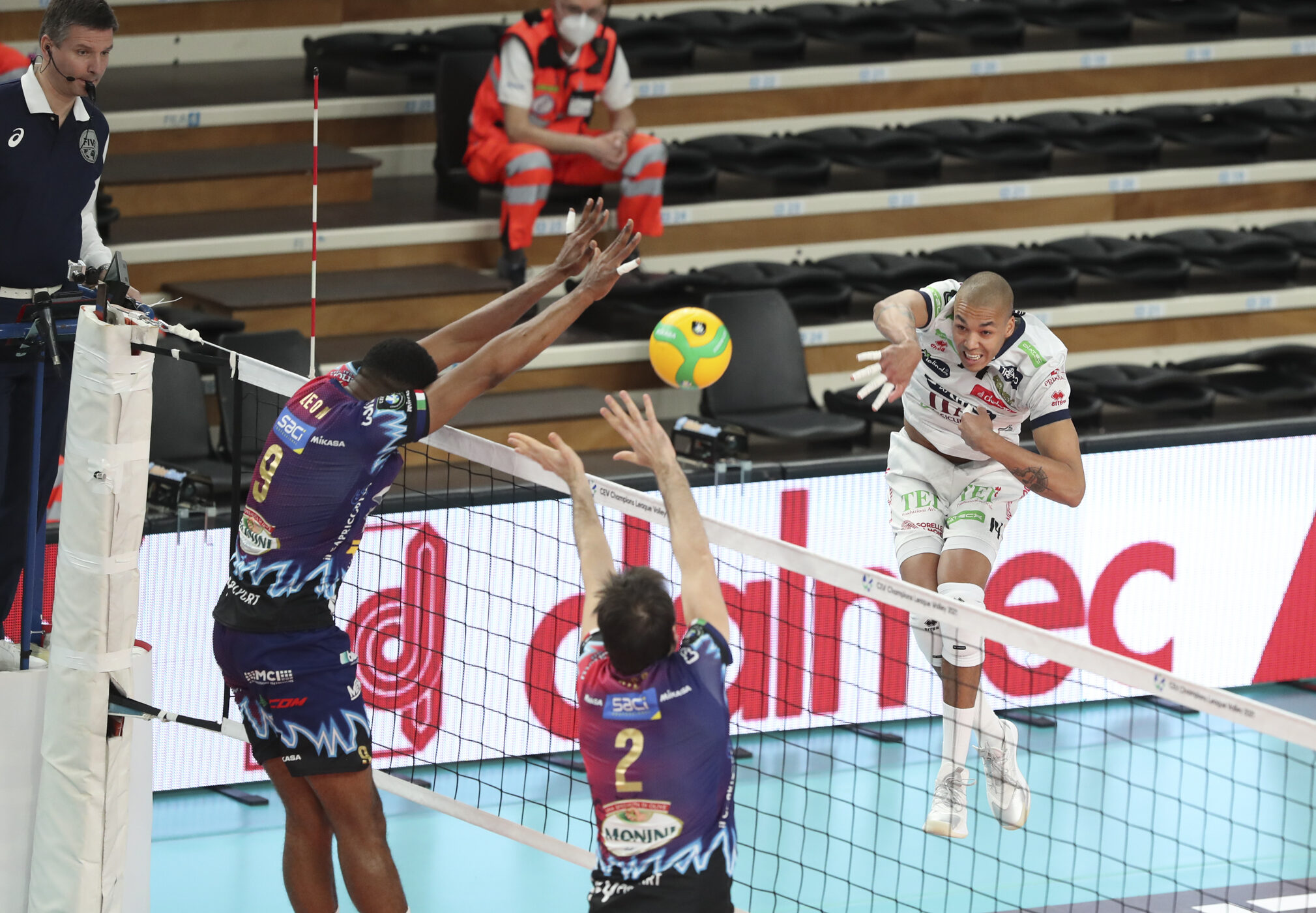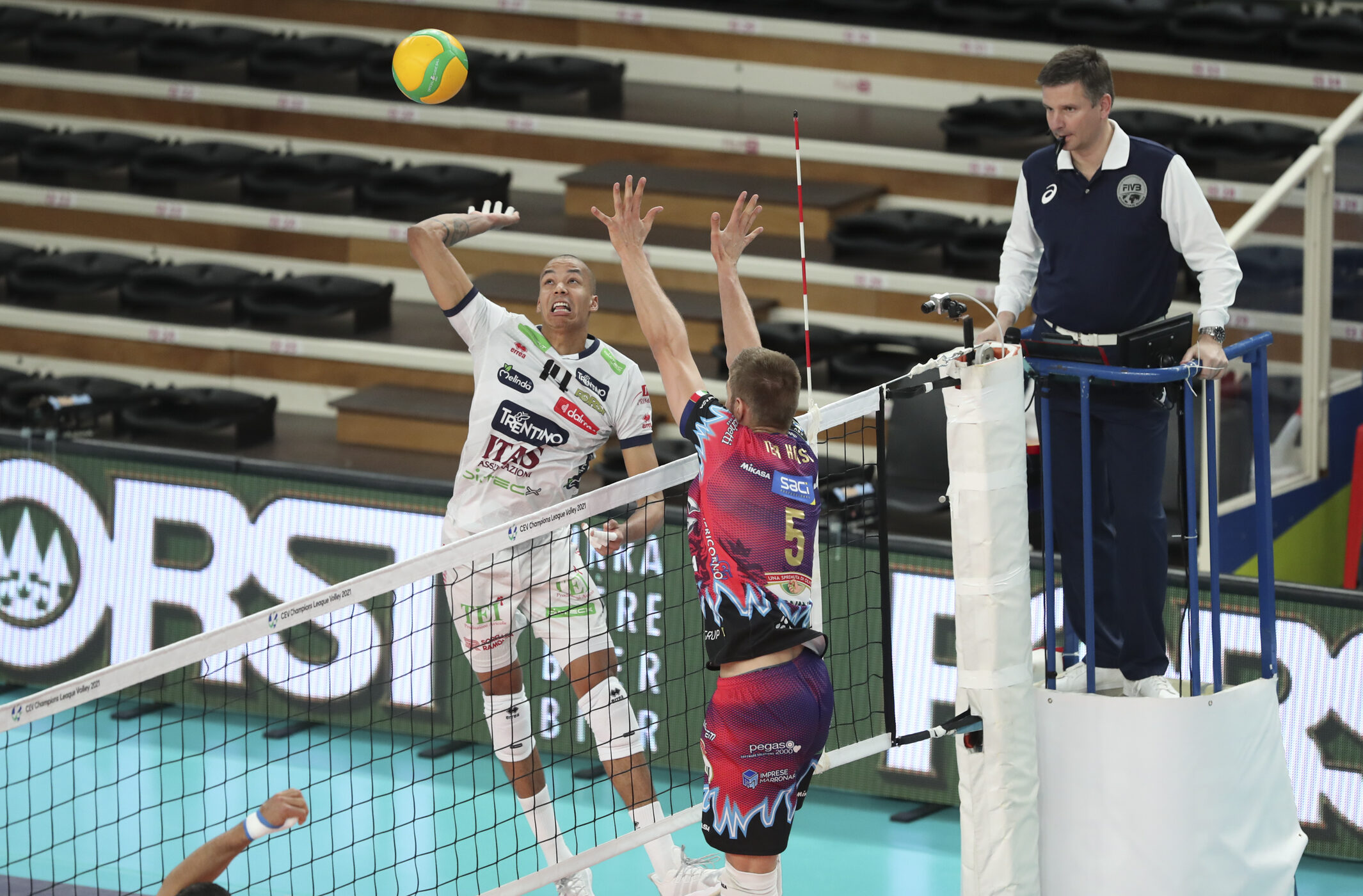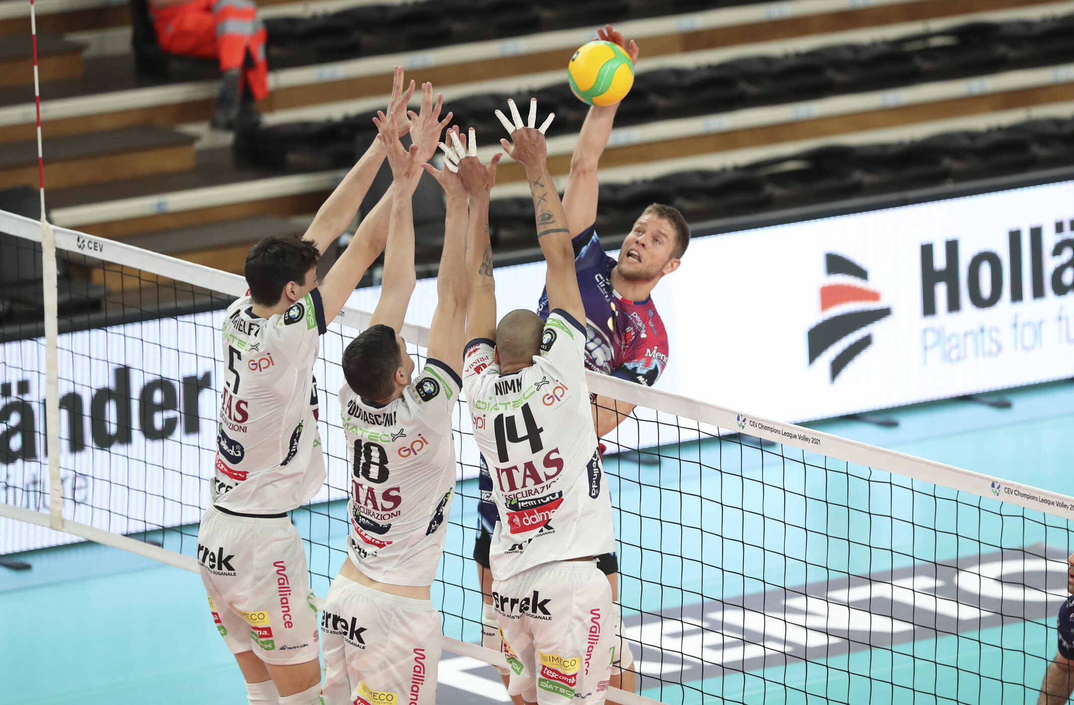 Set 3 In de derde set ontvouwde zich nog een mooie strijd. Perugia pakte drie punten voorsprong en hield tot 15-17 het initiatief. Maar het bleek onvoldoende. Trentino rechtte de rug, scoorde vier punten op rij (waaronder een prachtig blok van Abdelaziz op Wilfredo Leon) en pakte het overwicht terug. Het eerste matchpoint werd nog door Sole’ weggeslagen, maar daarna was het Abdelaziz die keihard toesloeg toen spelverdeler Giannelli hem de mogelijkheid gaf. Met 25-23 pakte Trentino de set en de overwinning.