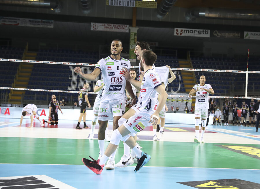 Het was Trentino Volley tot op heden niet gelukt om ooit te winnen in het Eurosole van Civitanova. Tientallen wedstrijden gingen (weliswaar vaak met minimaal verschil) verloren, maar gisteren heeft de ploeg van Abdelaziz en Kooy deze negatieve reeks doorbroken. Opvallend genoeg stonden aan de kant van Civitanova De Cecco en Leal – beide twee weken uit de running vanwege corona – in de basis, en de thuisploeg begon sterk. Het liep al snel uit naar 5-1, 8-3 en 16-11, maar na een matig begin bracht Abdelaziz via een ace en nog een breakpoint op zijn service zijn ploeg dichtbij. Het kwam zelfs op 23-23, maar het waren nota bene Leal (ace) en De Cecco (blok) die het 25-23 maakten. In set twee had Trento het betere van het spel, en bleef het Civitanova steeds met twee punten voor. Abdelaziz en een geweldigde Lucarelli waren aanvallend beslissend en zo kwam Trento langszij. Civitanova voerde de servicedruk op en mede door vier directe aces tegenover acht servicefouten van Trento pakte de thuisploeg een 2-1 voorsprong. Halverwege de vierde set pakte Civitanova wederom een ruime voorsprong (14-9), totdat Dick Kooy de jonge Michieletto verving. Met de voet haalde hij een harde bal van de grond (afgemaakt door Abdelaziz), wat uiteindelijk de inleiding was voor een comeback. Wederom door twee verdedigingsacties van Kooy ging Trento eroverheen (14-15). Op 19-19 was het Nimir met een ace die een belangrijke break maakte. En Lucarelli maakte op zijn beurt later de set met een ace af. Ook in de tiebreak keek Trento tegen een achterstand aan, maar een blok en een aanval van Prodascanin bracht de stand op 11-11. Later was het Lucarelli, verreweg de man van de wedstrijd, die met twee aces de wedstrijd voor Trento in stijl naar zich toe trok (12-15). Nimir Abdelaziz was zoals altijd belangrijk met 21 punten (40% aanval, 2 aces en 2 blokpunten), maar een geweldige Lucarelli (23 punten; 68% aanval, 5 aces tegenover 0 fouten en een blok) en een sterke invalbeurt van Kooy (57% aanval) hadden een groot aandeel in de overwinning.