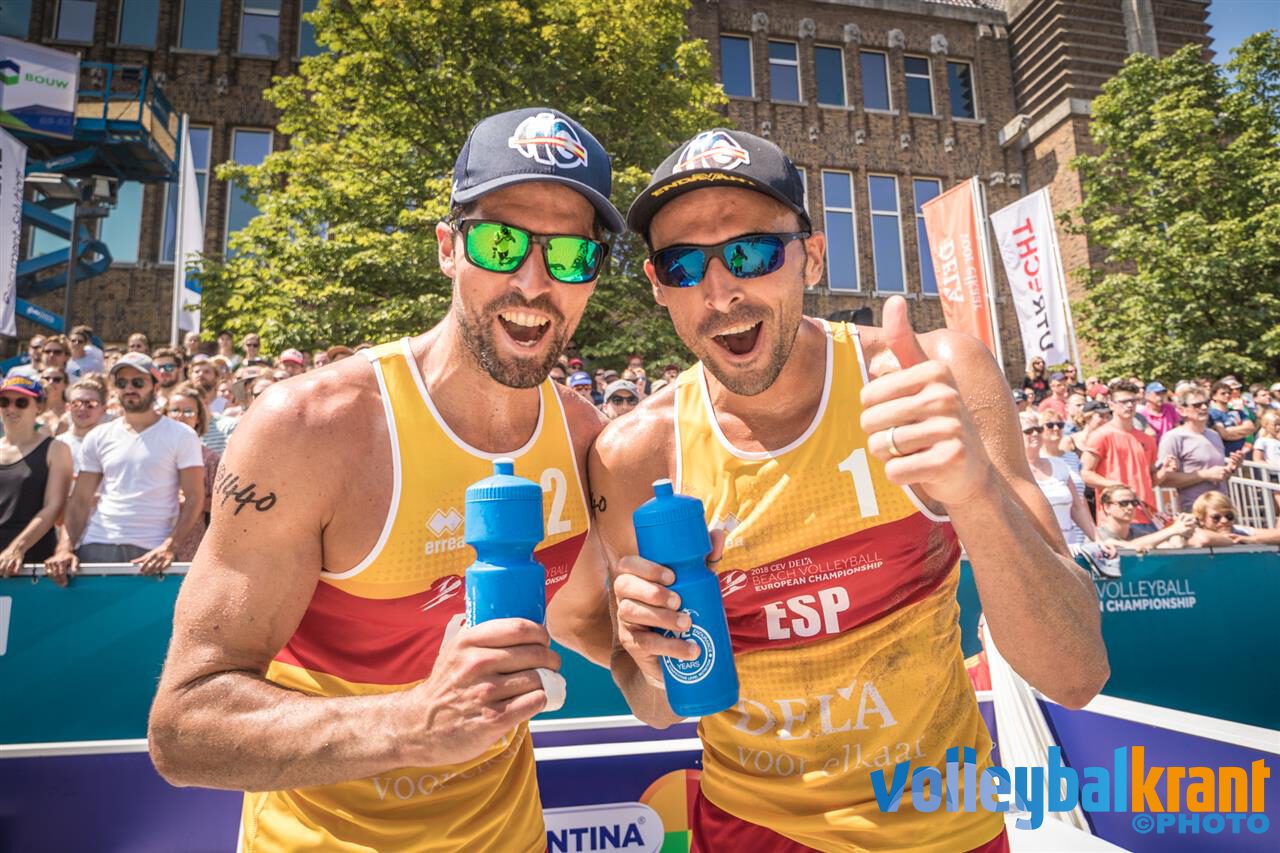 Nog een plekje te vergeven en dat plekje zou gaan naar Spanjaarden of Zwitsers. In een volgepakt stadion in Utrecht was de sfeer uitstekend, ook al was er geen Nederlandse inbreng. Dit was zichtbaar genieten voor de Zwitsers en Spanjaarden. De teams waren aan elkaar gewaagd in de kwartfinale. Er werd eigenlijk constant op de side-out gespeeld. Het publiek kreeg prachtige rally’s voorgeschoteld. Met name publiekslieveling Marco Krattiger werd luid toegejuicht na diverse kill-blocks. Toch was het telkens de ervaring van Herrera/Gavira dat de doorslag gaf. Zij bleven uiterst koelbloedig en maakten erg weinig fouten. De eerste set ging met 21-19 naar Spanje. De tweede set ging ook voornamelijk op side-out. Op 14-15 miste Krattiger een belangrijke ‘dank-je-wel-bal’. Hij werd keihard afgeblokt. Hierop volgende een eigen fout en het verschil was drie punten. Dit gat konden de Zwitsers niet meer dichten. De Spanjaarden wonnen met 21-18 en rollebolden door het zand van vreugde.