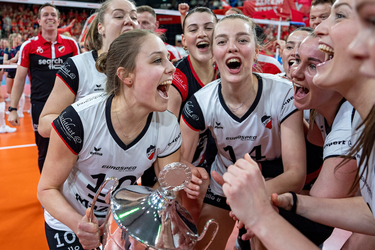 Ook in de vierde set vloog het team van de broers Bart en Thijs Oosting uit de startblokken en op de service van Berndsen werd het verschil negen punten. Zwolle verkleinde het verschil nog wel, maar het bleek niet meer opgewassen tegen de servicedruk en verdedigende kwaliteiten, dankzij onder meer libero Pippa Molenaar, van Apollo 8. Als aanvoerster mocht Koebrugge op het eerste matchpoint serveren en eindigde de wedstrijd in stijl met een ace. Speelsters en technische staf vlogen elkaar na het laatste punt in de armen om daarna samen met het publiek een flink feestje te vieren. Voor Thijs Oosting, die na acht jaar afscheid gaat nemen bij Apollo 8, zorgde deze bekerwinst alvast voor een afscheid met glans.