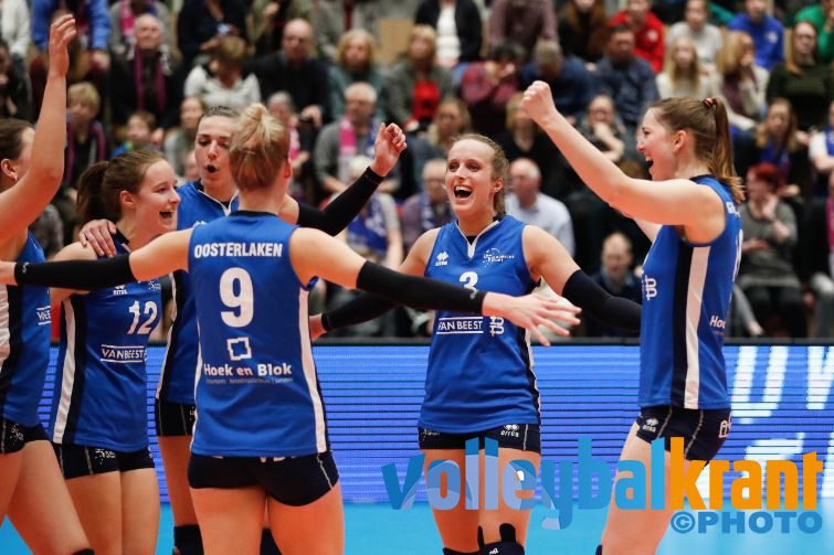 Sliedrecht startte met Vossen, van Rooijen, Oosterlaken, Hullegie, Thijssen, Ghijssen-Jans en Reesink. Bij Eurosped mochten Wopereis, Oude Luttikhuis, Kamphuis, Knijff, Gommans, Beach en Mota in de basis beginnen. De teams gaan gelijk op en wisselen telkens een voorsprong van 1 à 2 punten af. Halverwege is het de servicedruk van Sliedrecht die een verschil op het scorebord zet. Dat verschil hield de Sliedrechtse ploeg tot het einde vast en kwam via 25-21 op 1-0 in sets.