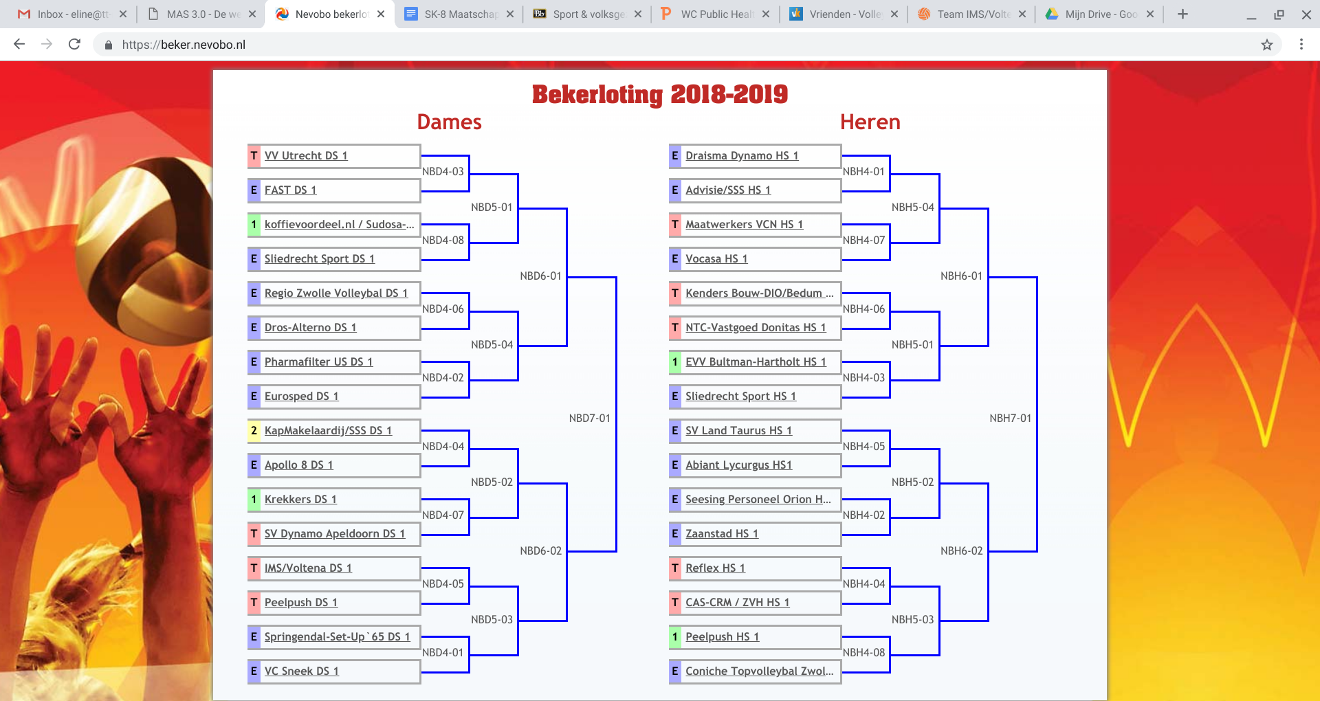 Het bovenste gedeelte van het schema lijkt het zwaarst, met zes van de negen (TT/Papendal doet niet mee) eredivisieploegen. Dat zijn ook niet de minste teams, want de top vier van de huidige eredivisiestand zitten allemaal aan dezelfde kant van het schema. Sliedrecht Sport begint de weg richting titelprolongatie met een uitwedstrijd in Assen. Sudosa-Desto, de nummer 1 van de 1e Divisie A, krijgt de huidige bekerwinaar op bezoek. De andere niet-eredivisionist uit de bovenste helft is VV Utrecht. Die mogen het thuis opnemen tegen FAST, de nummer 2 van de Eredivisie. Regio Zwolle Volleybal speelt thuis tegen Dros-Alterno, terwijl Eurosped (koploper in de Eredivisie) op bezoek gaat bij US.