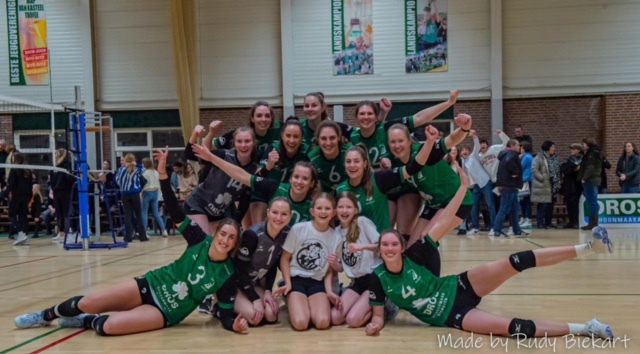 We pakten ons bij elkaar en keken elkaar even goed in de ogen aan. De volgende set zal van ons zijn. Door net spel en weinig fouten kwamen we snel op een nette zes punten voorsprong. Maar de set was nog niet gespeeld. Krekkers kwam met een goede serve serie in één klap terug, waardoor het weer gelijk stond en we opnieuw moesten beginnen. Het bleef tot het einde van de set super spannend. We kwamen achter te staan en Krekkers kreeg op 23-24 setpoint. We wisten dat als we deze set zouden verliezen, het nog wel eens lastig kon worden om de wedstrijd te winnen. Met een mooie pass van Silke en een goede set van Britt, scoorde Noa de bal net voor de achterlijn. Door een ace kwamen we op (25-24), maar de laatste bal werd nog even flink afgeblokt door Krekkers waardoor de set nog niet van ons was, 25-25 gelijk. Uiteindelijk wonnen wij de derde set met 28-26. Voor ons was het duidelijk, dit wordt de laatste set. En zo stonden we ook in het veld. We speelden weer zoals we de eerste set speelden, we maakten de ballen af en Krekkers had moeite met onze serve en blokkering. Marloes serveerde ons tot 24-9 voorsprong, waarna er nog een kleine opleving van de Krekkers, was. Met 25-14 wonnen we de set en daarmee de wedstrijd. Het was een spannende partij tegen een club die we goed kennen. Fijn om de punten thuis te houden en zo op de eerste plek te blijven staan. Het was een leuke week volleybal. Volgende week spelen we weer uit, deze keer tegen Dynamo Tubbergen. We hebben er zin in’, sluit Imre tevreden af.