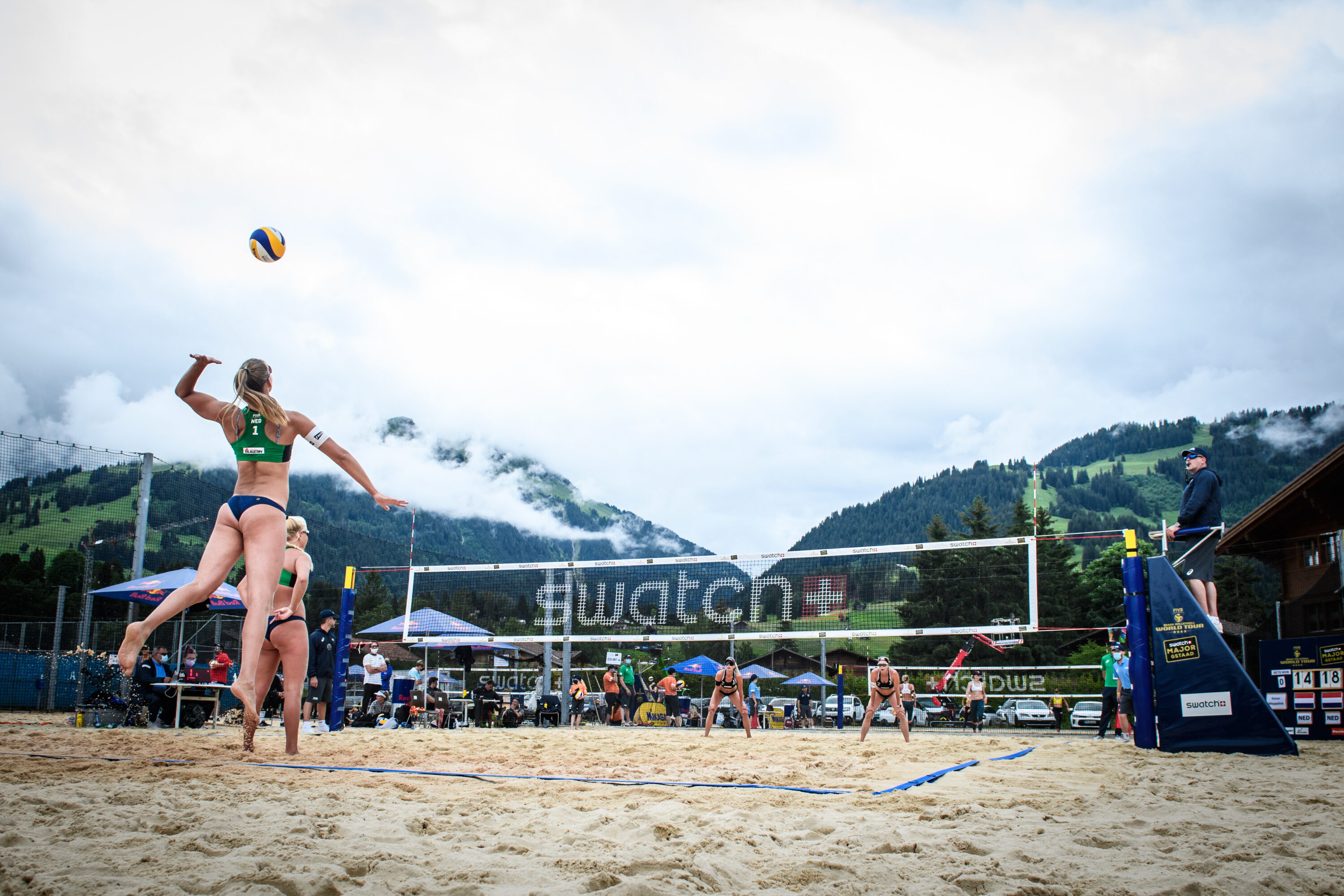 Na de nipte uitschakeling van de zusjes van Driel in de kwalificatie zijn het Keizer/Meppelink en Stam/Schoon die het in Gstaad voor Nederland moeten doen. Ze kwamen elkaar vandaag direct tegen, want Stam/Schoon werd na de winst in de kwalificatie toegevoegd aan poule E. Het werd een mooie strijd, waarin Katja Stam en Raisa Schoon beter begonnen. Na 21-18 in de eerste set kwamen de ervaren Keizer en Meppelink echter beter in het spel en wonnen ze na de tweede set (14-21) ook de derde. Nadat Stam en Schoon steeds een kleine achterstand hadden kreeg Stam op 13-14 een kans om de gelijkmaker te maken, maar was het nota bene verdedigster Sanne Keizer die haar af wist te blokken en de overwinning binnen wist te trekken (13-15).