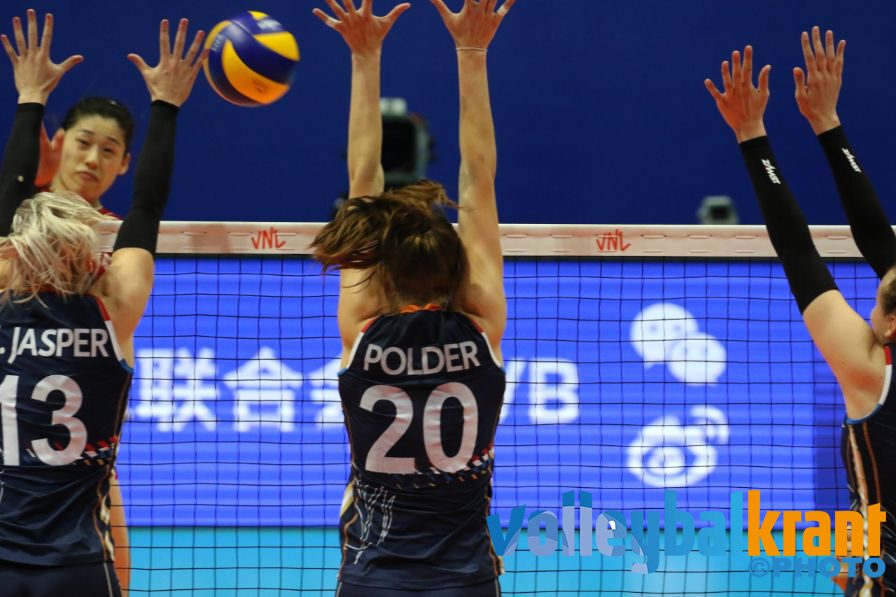 Beltrami koos voor een verrassende opstelling met Van Aalen, Meijers, Korevaar, Polder, Oude Luttikhuis, Jasper en Knip. Zo speelde Korevaar nog geen minuut in de afgelopen weken van de VNL. China trad daarentegen met een zeer sterke opstelling aan, met onder andere Zhu Ting. Toch liet Nederland zich in het begin van de set niet over zich heen lopen. Scores van Jasper en Meijers hielden Nederland in het spoor (8-6). De matige servicedruk zorgde er echter voor dat het thuisland toch makkelijk de voorsprong vast kon houden (16-11). Drie goede services op rij beslisten de set in het voordeel van China (25-16).