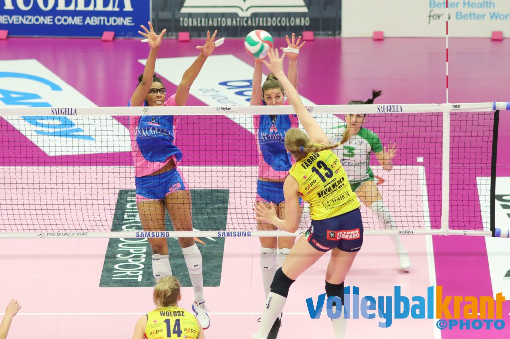 Voor de 2500 toeschouwers kreeg Monza eigenlijk geen kans om in het juiste ritme te komen. Conegliano pakte meteen het initiatief en liep in de 1ste set van 10-16 uit naar 12-21. Exact hetzelfde beeld was in de overige twee sets te zien. Anne Buijs was bij Monza samenmet Hanna Orthmann de bestscorende aanvalster. Beide speelsters pakten 8 punten. Bij Conegliano sloeg Samanta Fabris de meeste punten binnen (14). Robin de Kruijf maakte 10 punten voor haar ploeg.