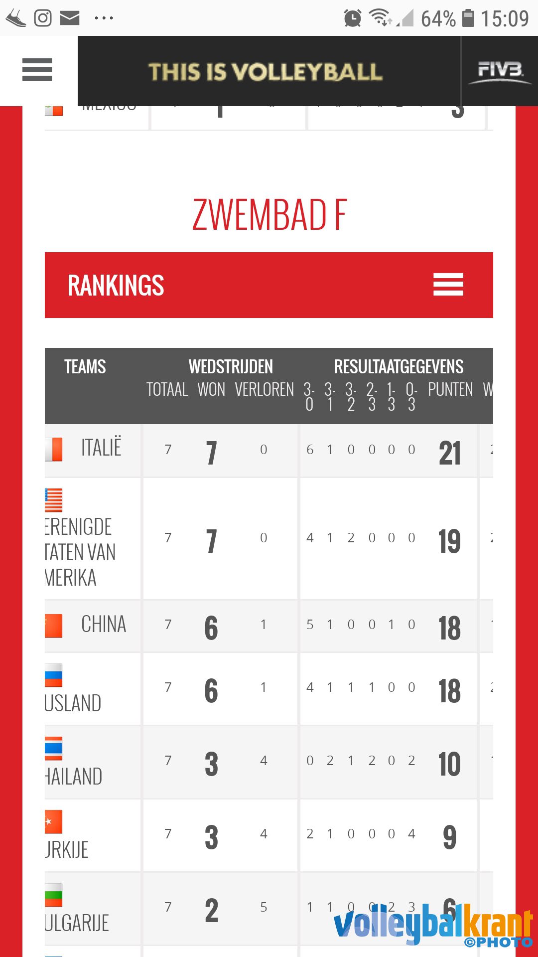 In beide poules maken nog vier ploegen kans op een plaats bij de beste drie. Die is nodig voor plaatsing bij de Final Six. Deze zes ploegen gaan vanaf zondag in twee poules van drie landen uitmaken wie zich plaatsen voor de halve finales. De strijd om een plaats bij de Final Six is het spannendst in poule F. De koploper heeft daar 21 punten, nummer 2 heeft één punt minder en de nummers 3 en 4 (China en Rusland) staan met 18 punten gelijk. In de resterende twee wedstrijden kent Rusland het zwaarste programma, met Italië (woensdag) en China (donderdag). China speelt woensdag tegen de VS. Italië treft de Amerikanen donderdag.