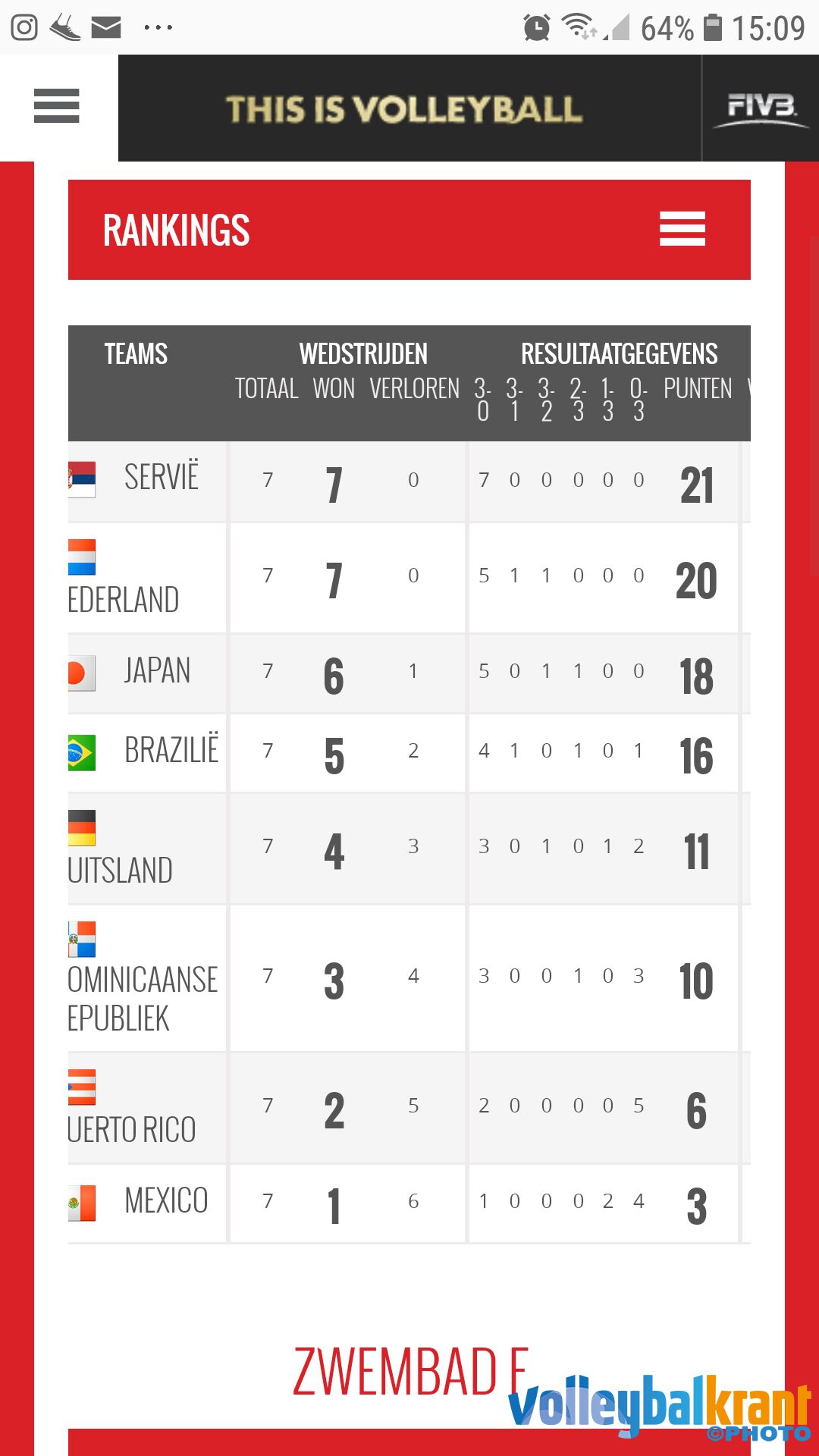 In de poule van Nederland zijn de verschillen tussen de eerste 4 duidelijk groter. Servië leidt met 21 punten, gevolgd door Nederland met 20 punten. Nummer 3 is Japan, met 18 punten. Brazilië verloor al twee keer en staat op 16 punten. In de wedstrijd tegen Brazilië kan Oranje zich woensdag definitief plaatsen. Bij een vijfsetter is Nederland zeker door. De slotwedstrijd tegen Servië op donderdag mag dan verloren worden. Waarschijnlijk strijden Brazilië en Japan om de derde ticket voor de Final Six. Beide landen treffen elkaar donderdag in de slotwedstrijd van de tweede ronde. Japan treft woensdag koploper Servië.
