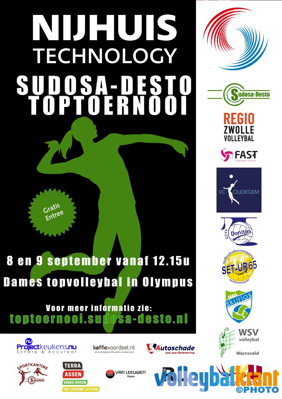Komend weekend is het zover! De vierde editie van het Nijhuis Technology Sudosa-Desto dames Toptoernooi. Twee dagen lang wordt er op het hoogste niveau gevolleybald in sporthal Olympus in Assen. Het deelnemersveld is de afgelopen jaren nog nooit zo sterk geweest. Uit de Eredivisie zullen Regio Zwolle Volleybal, Fast Flamingo’s-Activia en Springendal Set-Up ’65 deelnemen. Drie ploegen die elk jaar sterker worden in de Eredivisie. Daarnaast zijn we trots dat VC Oudegem komt. Deze topploeg uit België heeft internationale ambities en komt naar Assen om zich hierop voor te bereiden. Met Skurios Borken Volley (2e Bundesliga) krijgt het toernooi nog meer een internationaal aanzien. Het totale deelnemersveld bestaat uit: OBEG Donitas, Fast-Flamingo’s-Activia, Skurios Volleys Borken, Regio Zwolle Volleybal, VV Utrecht, Koffievoordeel.nl/Sudosa- Desto, Springendal-Set-up’65,VC Oudegem en WSV.
