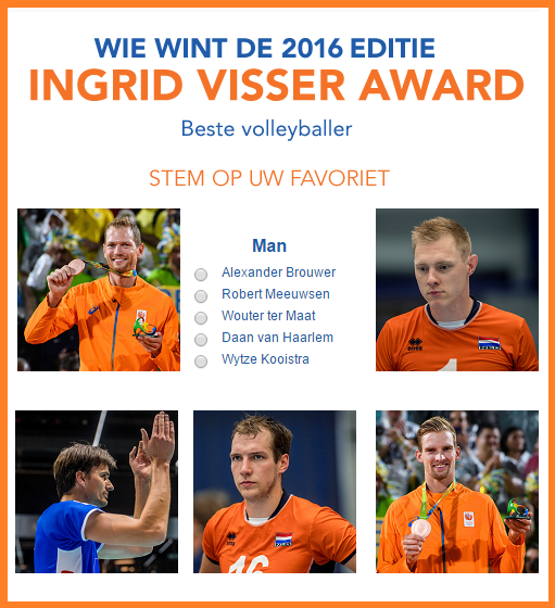 Bij het openen van Volleybalkrant.nl verschijnt er een pop-up waar u uw stem kunt uitbrengen op één genomineerde per categorie (man, vrouw, coach en talent). U kunt tot en met 4 januari 2017 stemmen. Op zondag 8 januari worden de Ingrid Visser Awards uitgereikt bij het NK Beach Indoor in The Beach (Aalsmeer).