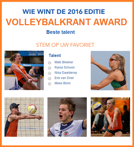 ...Mats Bleeker, Mees Blom, Nika Daalderop, Emi van Driel en Raisa Schoon. Daalderop kan als eerste volleybalster deze talentenprijs voor de tweede keer (op rij) winnen. De andere vier talenten zijn voor het eerst genomineerd voor deze Volleybalkrant Award.