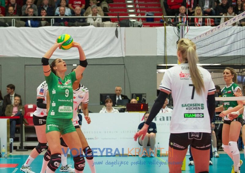 In de eigen Margon Arena, voor 3000 toeschouwers, werd het topduel van deze speelronde een prooi van de regerend landskampioen. Alleen in de eerste twee sets kon het bezoekende Schwerin, zonder Alice Blom, enigszins in de buurt blijven van de concurrent. In de derde set walste Dresden over de gasten heen (25-10!) die de tweede nederlaag op rij leden. Laura Dijkema, als spelverdeelster dominant en goed voor liefst 8 punten, werd uitgeroepen tot MVP van het duel, Myrthe Schoot was de libero van dienst.