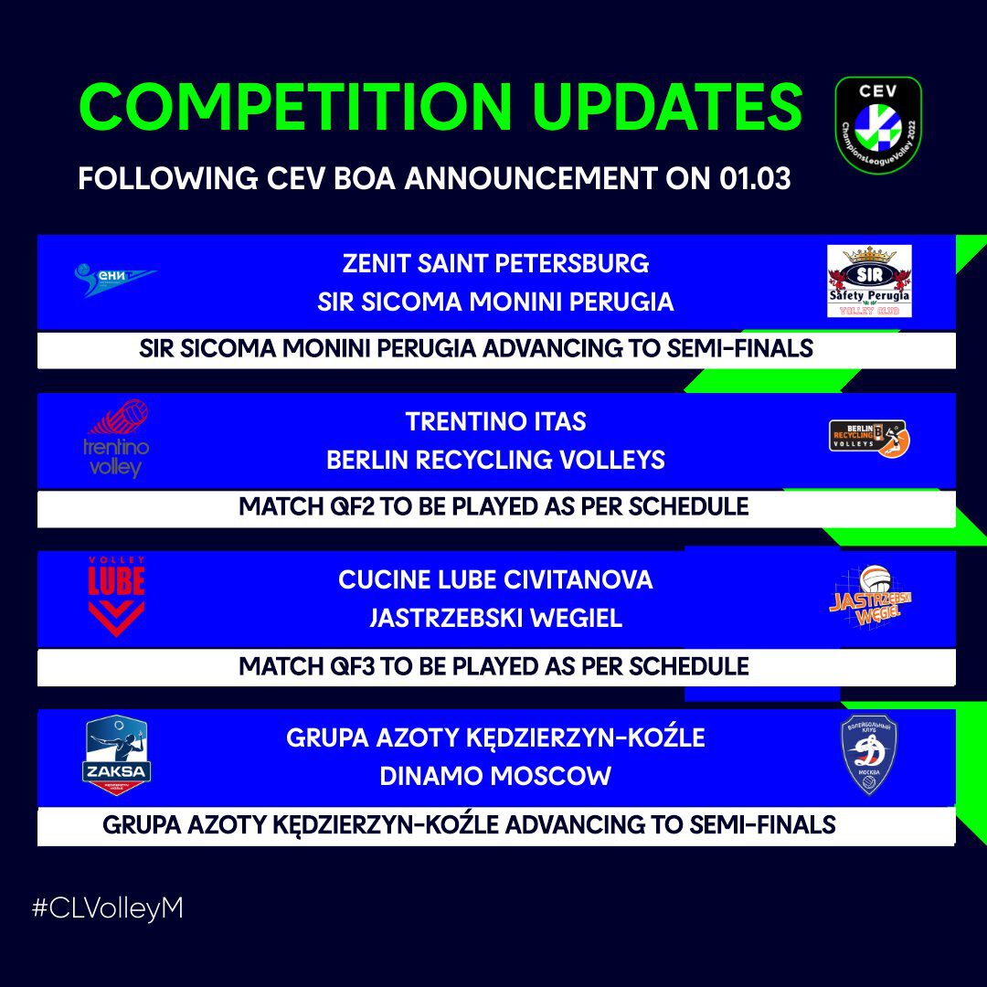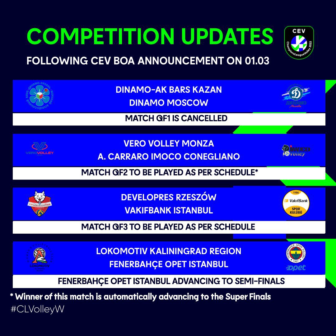 Bij de Champions League vrouwen vallen er maar liefst 3 teams weg. Zowel Dinamo Kazan, Dinamo Moskou en Lokomotiv Kaliningrad zijn per direct uit het toernooi verwijderd. En omdat in de eerste kwartfinalewedstrijd Kazan en Moskou elkaar zouden treffen, betekent het dat de winnaar van Conegliano (De Kruijf) en Monza meteen in de finale staat. Het hoeft dan helemaal geen halve finale te spelen. Het Vakifbank van Guidetti wordt echter extreem benadeeld. Om de finale te halen moet het team eerst langs Rzeszow, om vervolgens in de halve finale tegen Fenerbahçe te spelen. Maar Fenerbahçe staat zonder te spelen al in de halve eindstrijd, want tegenstander Kaliningrad ligt er zogezegd uit. Alles behalve eerlijk dus.