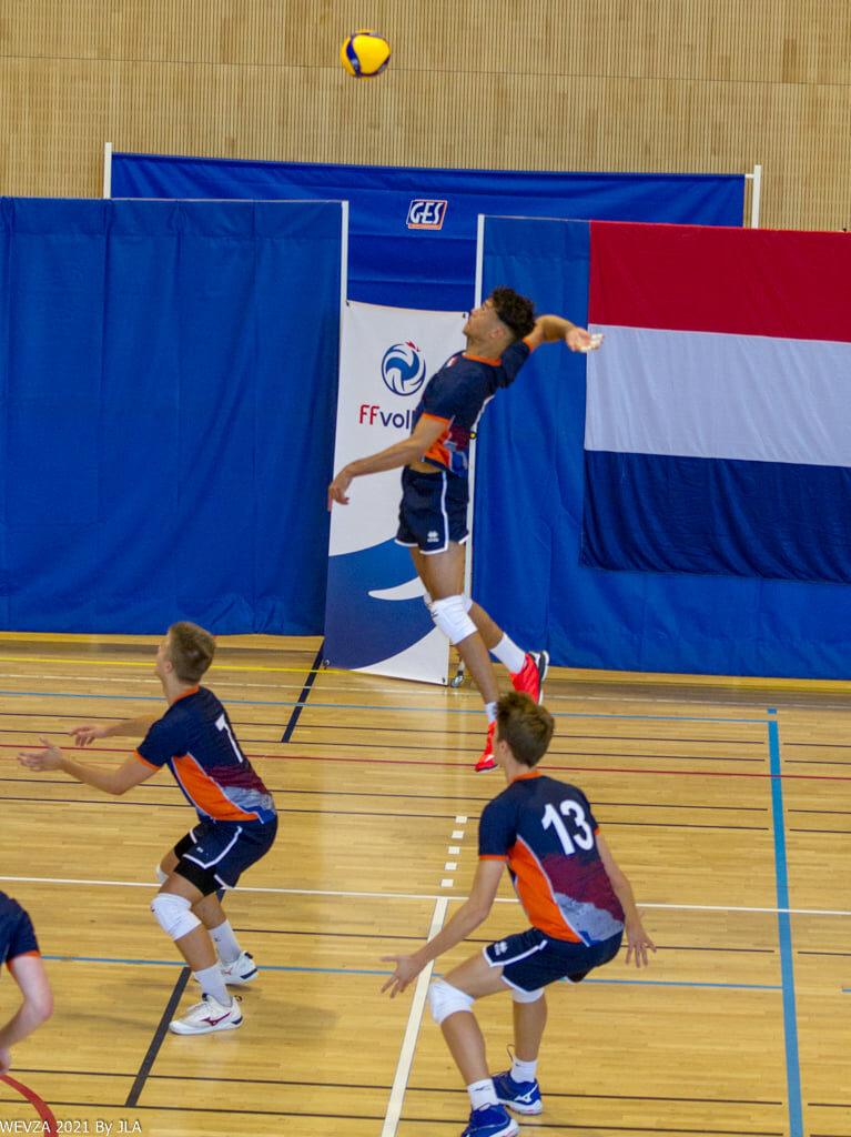 Coach Arne Hendriks startte met Kees Merkx, Kian Macnack, Guus Boer, Thomas van Bladel, Jelle Bosma, Sjoerd Zegwaard en libero Alek Aleksov. De start in de eerste set was voor België. De spelverdeler serveerde een ace en later voegde Simonluca Vlahovic er nog twee aces bij. Via time-outs op 2-7 en 6-13 probeerde Arne Hendriks het tij te keren. Vanaf 11-20 begon Oranje via lange rally’s meer grip op het spel te krijgen. Een lange service-serie van Kees Merkx bracht Oranje op 15-20. Jelle Bosma onderscheidde zich aanvallend en nam een mooie overnameset-up voor zijn rekeing waardoor Kian Macnack kon scoren. Op 20-22 werd het nog even spannend, maar even later scoorde België na een geweldige rally toch het beslissende punt (22-25).