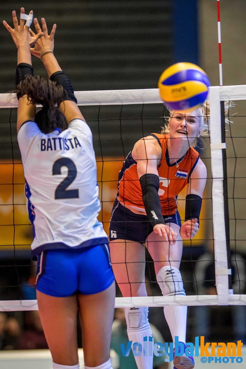 Laten we eerst even kijken naar de statistieken van het Nederlands team. Oranje is derde geworden in de 'poule des doods' met topteams als Italië, Rusland en Turkije. In de vijf wedstrijden die de meiden van coach Julien van de Vyver speelden in Valkenhuizen werden 19 sets afgewerkt. Daarvan werden er 9 gewonnen. Vijf speelsters van Oranje kwamen in al die sets in actie: libero Susanne Kos, Hester Jasper, Sarah van Aalen, Demi Korevaar en Lisa Nobel.