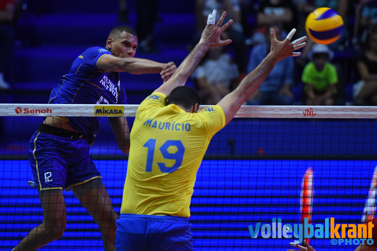 Frankrijk en Brazilië legden elkaar het vuur direct aan de schenen. Meteen in de openingsset was er al een woordenwisseling tussen de gewezen teamgenoten van Modena Earvin Ngapeth (volgend seizoen Zenit Kazan) en Bruno Rezende (verhuist naar Cucine Lube Civitanova) om te laten zien wie de grote man was. In die eerste set was het nog Rezende die zijn ploeg naar de winst spelverdeelde, hij kon met name Wallace de Souza in stelling brengen. Het werd 22-25. Ook set drie viel ten prooi aan de Zuid-Amerikanen, met 21-25 namen ze wederom de leiding.