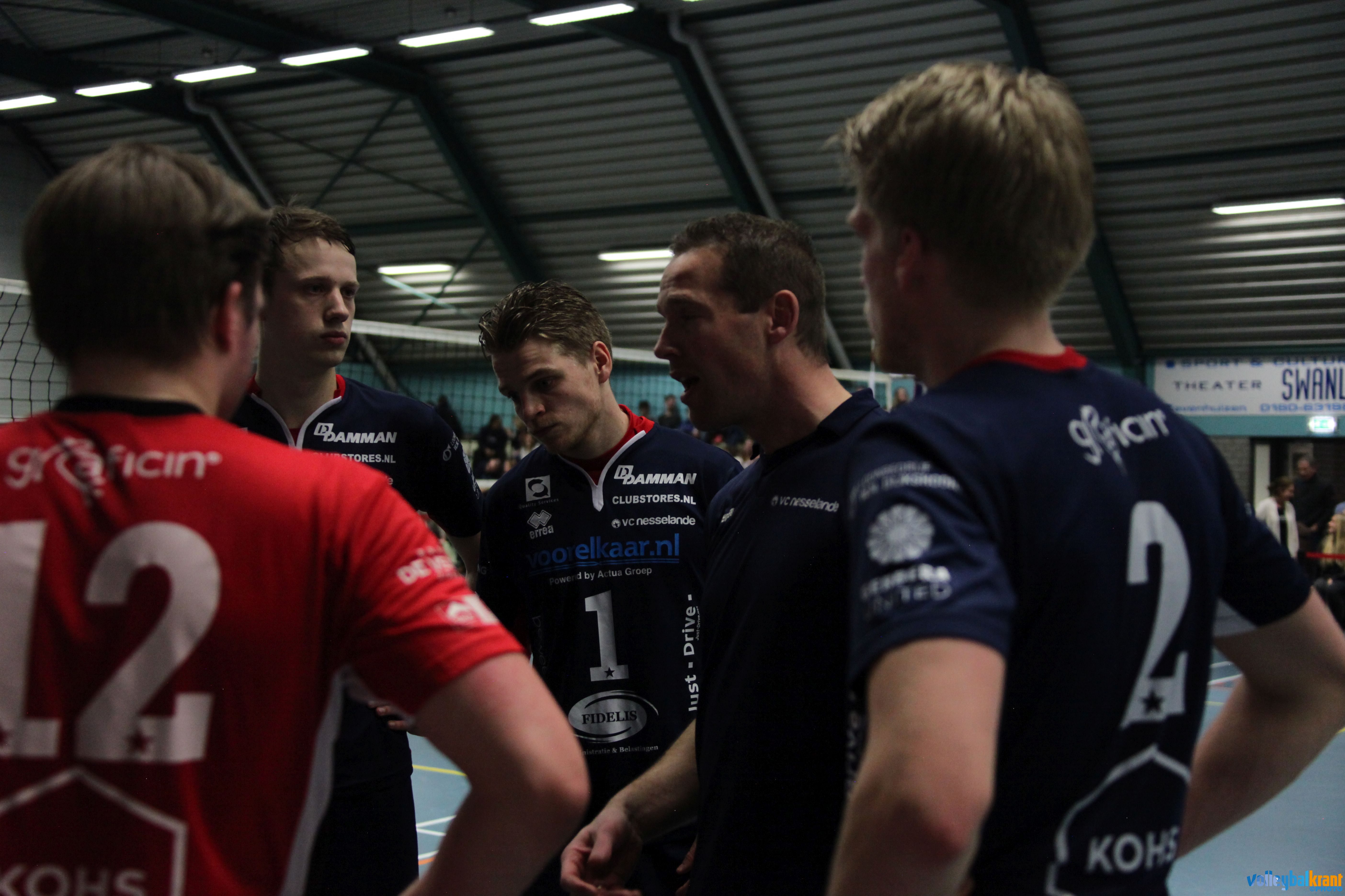 Trainer/coach Kristian van de Wel stuurde een aangepaste basis het veld in: Richard Rademaker, William de Graaff, Max van Mullem, Chris van Mullem, Jan-Jaap van Schuylenburg, Leroy Boerefijn en libero Thomas van Rij. Nesselande kon in het begin gelijke trend te houden met Prins Maar pas bij 7-10 nam coach Kristian van der Wel een time-out om zijn ploeg weer op de rails te krijgen. Maar Prins bleef goed georganiseerd spelen en wist Nesselande onder druk te zetten met hun service. Bij vlagen konden de Zevenhuizense heren sterke acties uitvoeren, die helaas door onnodige fouten werden afgewisseld en Prins nam deze set met 19-25 in hun bezit. In de tweede set leek het erop dat Nesselande de Naar juiste weg had gevonden en noopte Prins coach tot het nemen van een time-out bij 10-8. Nesselande kon dit tot 14-1`2 vasthouden en na een sterke servicebeurt van Prins werd de voorsprong weggevaagd naar 15-16. Prins liep verder uit maar door sterke aanvallen van de gebroeders Van Mullem werd een stand van 22-23 bereikt die Prins noopte tot een time-out. Na een sterke aanval en hecht blok kwam deze set met 22-25 in handen van de gasten. Coach Kristian van der Wel bracht in de derde set Rick Wiggers binnen de lijnen voor Richard Rademaker om extra power binnen het team te krijgen. Ook nu hielden de beide team in de beginfase elkaar goeds in evenwicht, waarbij Prins duidelijk een sterkere verdediging had waardoor zij de punten simpel konden binnen halen. Vooral de rally’s kon Prins winnen en ook nu werd de set met 17-25 door de gasten gewonnen.