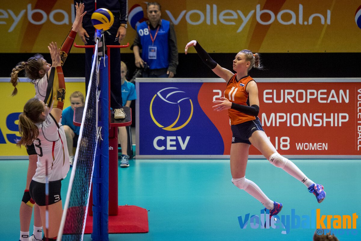 Twee goede services van Vera Mulder vergrootten de voorsprong (18-15), maar Duitsland kwam al snel weer op gelijke hoogte (18-18). Op de service van Demi Korevaar maakte Oranje even later het verschil en dwong via 20-25 een vierde set af.