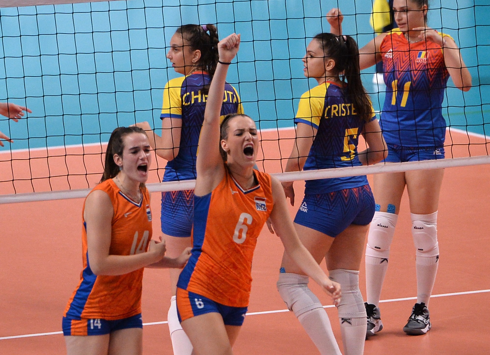 Op voorhand was al duidelijk dat als Jong Oranje van Roemenië zou winnen dat het een plek bij de laatste vier niet meer kon ontgaan. Wellicht zorgde dat voor wat extra spanning bij de selectie van bondscoach Eric Meijer, die opnieuw koos voor het zevental Sanne Konijnenberg, Nicole van de Vosse, Noa de Vos, Dagmar Mourits, Marije ten Brinke, Emily Silderhuis en Pippa Molenaar. Roemenië kwam op een voorsprong van vier punten in de eerste set. Het was Van de Vosse, die tot nu toe een zeer sterk toernooi speelt, dat haar team bij de hand nam en met een goede serviceserie ervoor zorgde dat Jong Oranje zeven punten op rij kon scoren. Daardoor wist Jong Oranje de achterstand weg te werken en de set vervolgens naar zich toe te trekken (25-20).