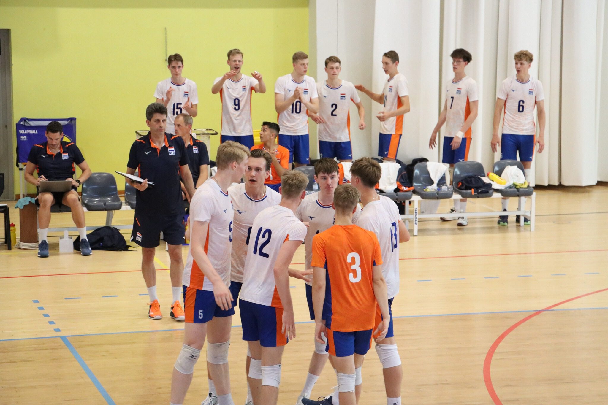 In de eerste set zag het er niet goed uit voor Jong Oranje. Op 4-7 moest Arnold van Ree al een time-out nemen. De achterstand bleef groeien en op 7-14 bracht Arnold van Ree de ambitieuze Zwollenaar, spelverdeler Sten van Tarel. Op zijn service kwam Jong Oranje terug naar 12-15. De pass bij Oranje bleef daarna matig en de Portugese diagonaal Rafael Pinto kon op 18-25 het winnende punt binnen slaan.