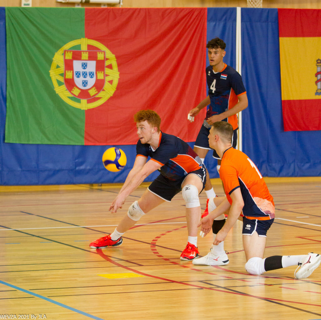 Bondscoach Arne Hendriks startte in de eerste set met Kees Merkx, Kian Macnack, Guus Boer, Thomas van Bladel, Sjoerd Zegwaard, Jelle Bosma en libero Alek Aleksov. Kian Macnack sloeg met zijn serve de eerste voorsprong binnen (4-2). Die voorspron werd geleidelijk uitgebouwd via 13-9 en 18-14. Op die stand zorgde Kees Merkx voor zoveel servicedruk dat Oranje vier punten op rij kon maken. Snel erna kon Guus Boer de set via een ace binnenslaan: 25-15. Oranje hoefde niet diep te gaan en kon het zich permitteren om ook negen punten voor Portugal te scoren door eigen serve- en aanvalsfouten. Kian Macnack en Jelle Bosma scoorden beide zes punten. Oranje scoorde 19 eigen punten: 3 aces, 13 aanvalspunten en 3 blokpunten.