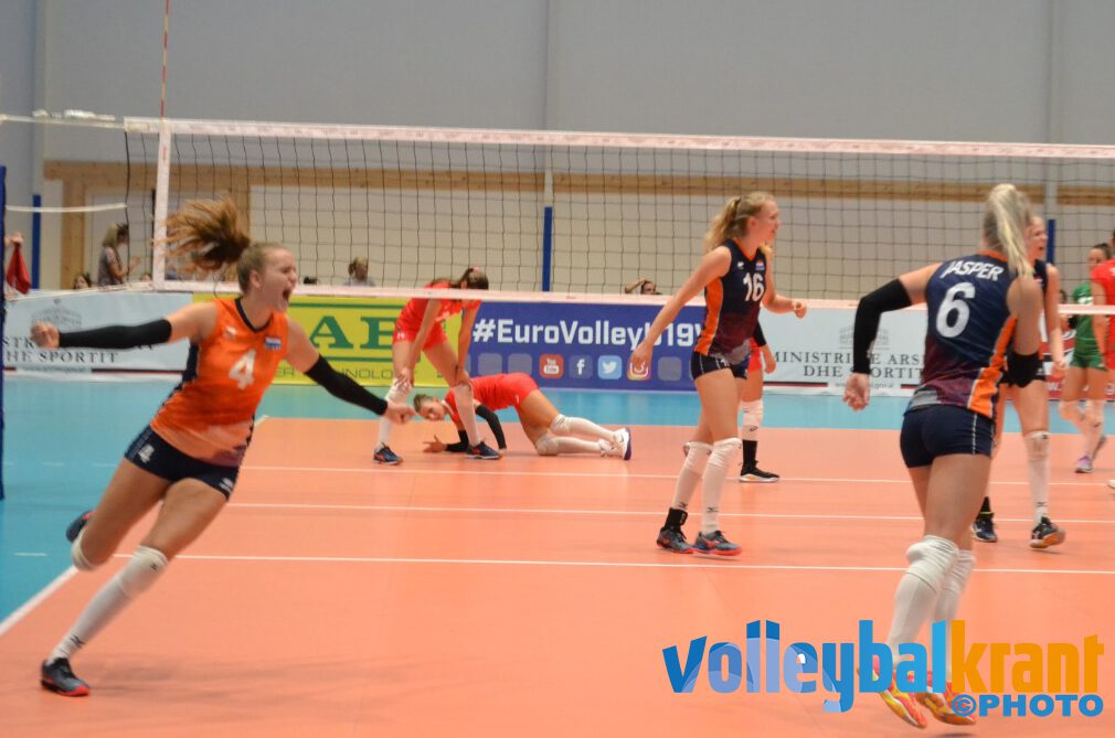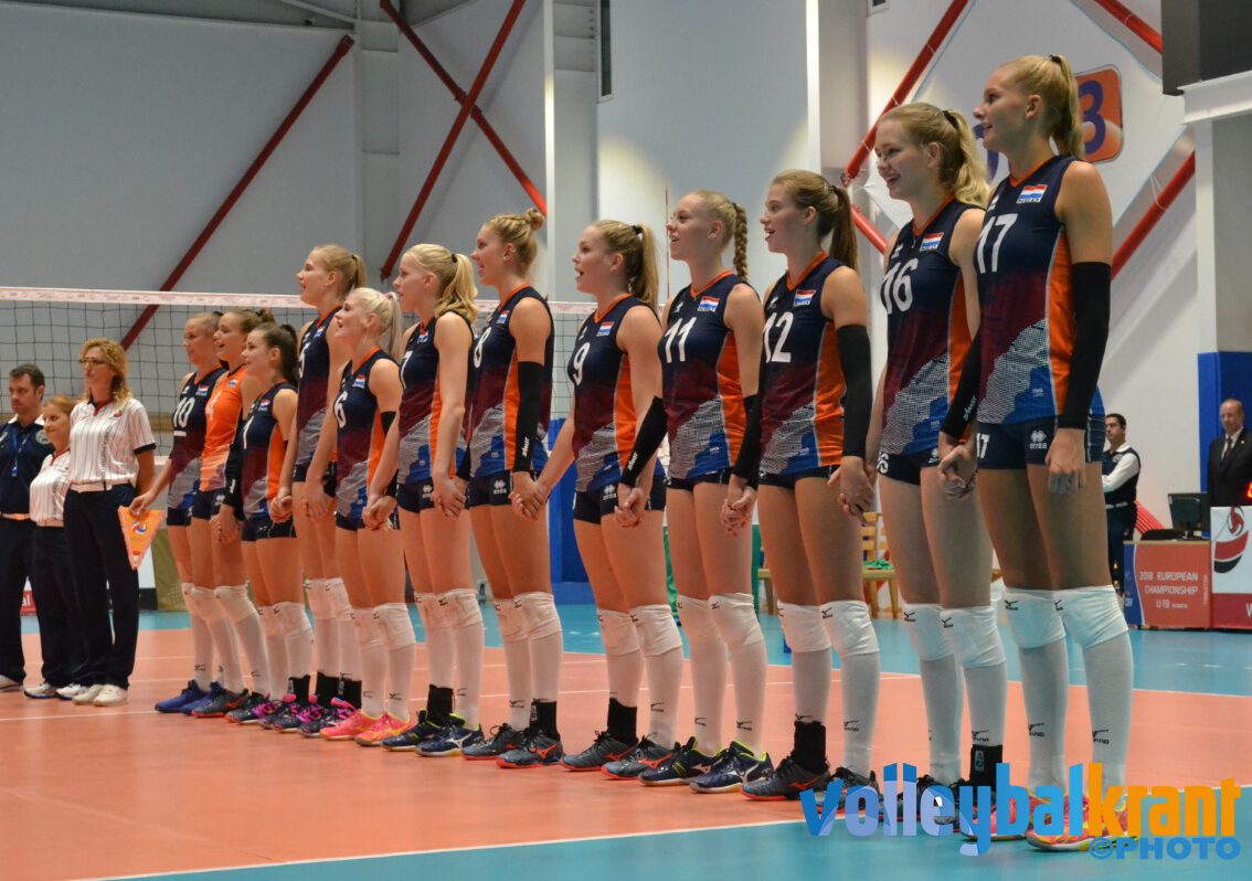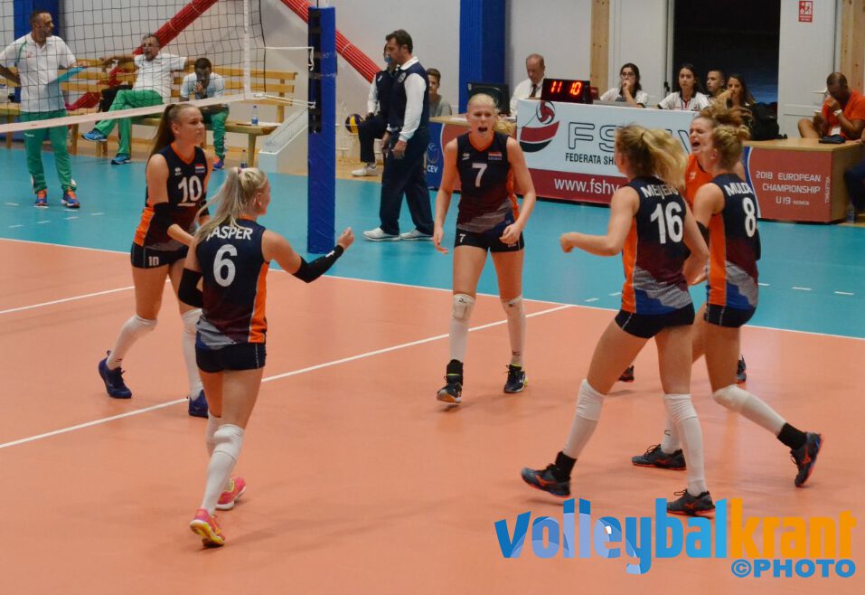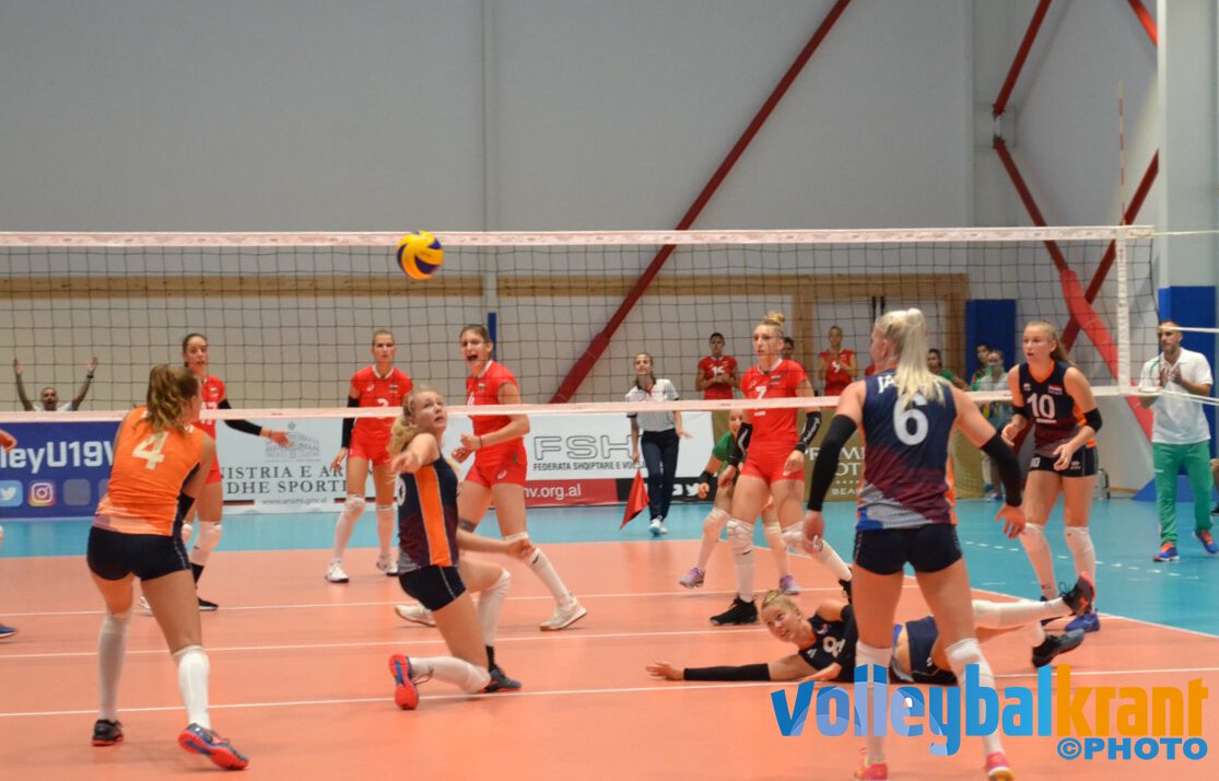 Bondscoach Julien van de Vijver startte weer met Sarah van Aalen (setter), Hester Jasper (passer/loper), Demi Korevaar (mid), Vera Mulder (diagonaal), Annick Meijers (passer/loper), Indy Baijens (mid) en libero Dagmar Boom. In de eerste set ging het lang gelijk op, waarbij een lichte voorsprong regelmatig van team wisselde. Op 16-16 kwam Annick Meijers aan de opslag en racete via 4 aces en 3 aanvalsfouten bij Bulgarije naar een setwinst met 25-16. Met 7 punten was Annick Meijers topscorer in deze set.