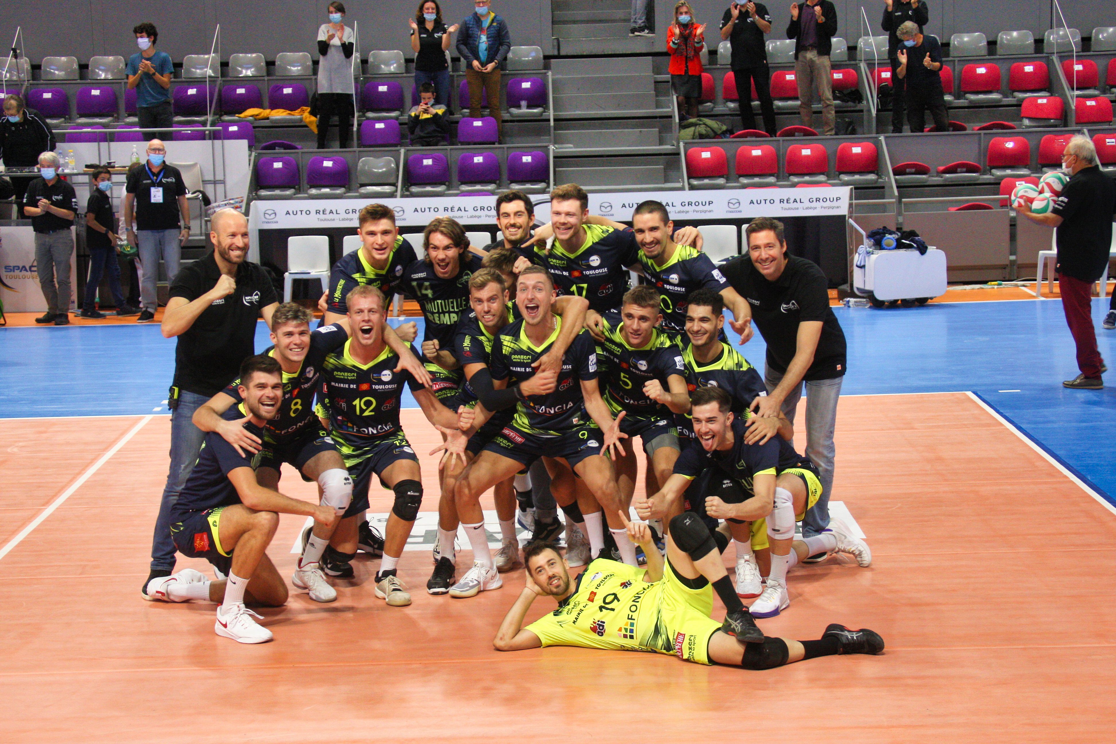 De bezoekers leken ook lange tijd af te stevenen op een zege. Na de eerste set met 25-20 te hebben verloren ging zowel het tweede als derde bedrijf met een 18-25 score naar de CEV Cup-deelnemer uit Montpellier. De spannende, gelijk opgaande vierde set eindigde dankzij twee punten van de Deen Oskar Madsen in extremis in het voordeel van de thuisclub: 28-26. In de tiebreak beschikten de Spacer’s met 15-12 over de langste adem.