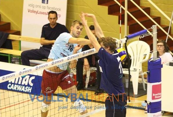 Antwerpen-trainer Kris Tanghe had dit weekend een probleem, want zijn ‘hoek-receptiespeler’ Balasz Bagics stond met een achillespeesblessure aan de kant. Tanghe besloot Jorna als passerloper in te zetten en Robin de Bont leider van het achterveld te maken. Geen verkeerde zet, zo bleek achteraf, want onze Nederlandse libero hield zich (natuurlijk) passend, maar ook aanvallend, prima staande. Hij scoorde vier van de acht ballen, wat een prima prestatie is. Setter Yannick van Harskamp vertelt: ,,Ik had voldoende vertrouwen in Gijs hoor, hij kan wel een balletje aanvallen! Hij doet af en toe ook in de training mee, dus ik weet wel dat hij het kan.”