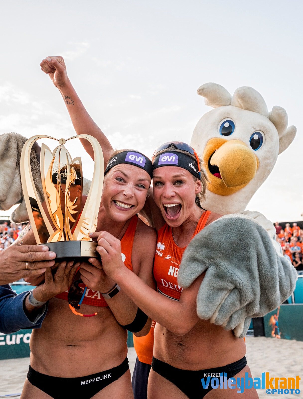 Sanne Keizer en Madelein Meppelink hebben zaterdagavond in het Zuiderpark in Den Haag de Europese Beachvolleybaltitel veroverd. In de finale was het Oranje duo in twee sets te sterk voor Nina Betschart en Tanja Hüberli uit Zwitserland. De finale eindigde in 21-16 en 26-24.