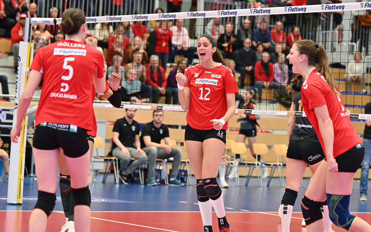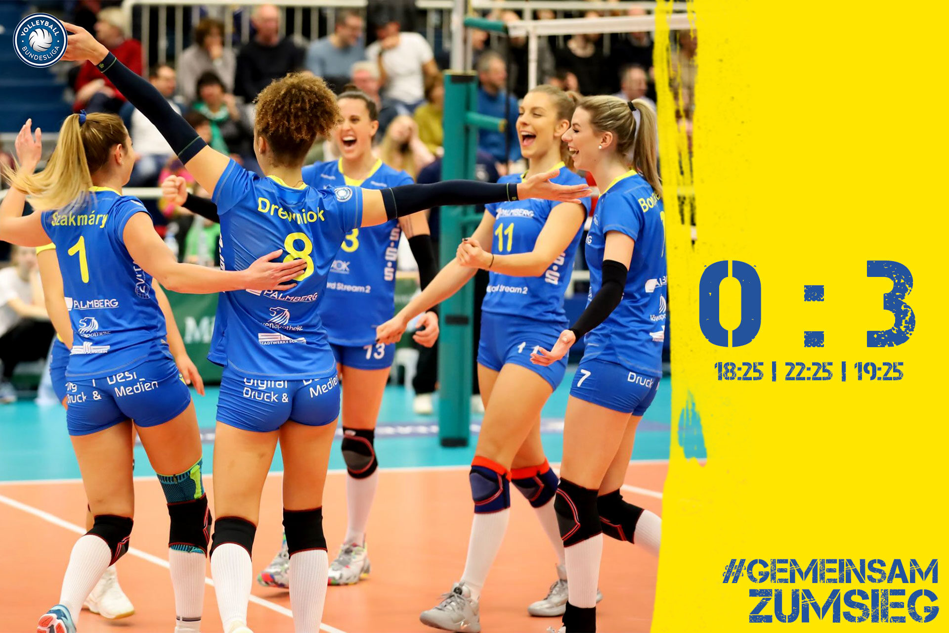 Schwerin ging bij NawaRo Straubing naar een soepele 0-3 winst, 18-25, 22-25 en 19-25. Britt Bongaerts en Nicole Ode Luttikhuis kwamen niet in actie. Schwerin is met 43 punten uit 16 wedstrijden nog steeds koploper. Stuttgart heeft evenveel punten maar een wedstrijd meer gespeeld. De nummers 1 en 2 ontmoeten elkaar in de laatste speelronde van de reguliere competitie op 14 maart. Potsdam behoudt na de 3-0 winst op Erfurt de 3e plaats.