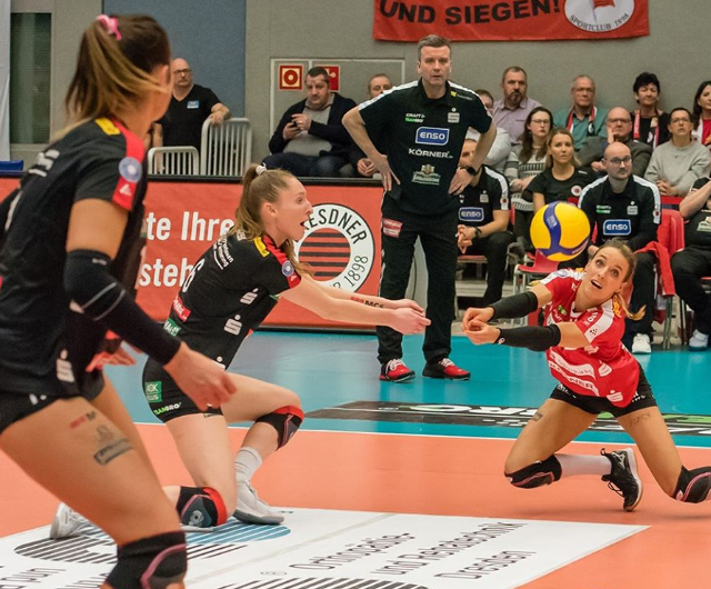 Rote Raben Vilsbiburg had na twee nederlagen wel weer behoefte aan een overwinning. Voor de hand liggend was de 2-3 bij het hoger geplaatste Dresdner SC niet. Iris Scholten begon bij Vilsbiburg op de bank, maar werd in de 1ste set al vrij snel ingebracht en mocht tot en met de 4e set blijven staan. Myrthe Schoot was de libero an dienst en deed verdedigend goed werk. Bij Dresdner SC startte Laura de Zwart in de basis en bleef tot en met de 3e set in het veld. Dresdner SC ging met 25-12 voortvarend van start. Vilsbiburg pakte met 24-26 en 23-25 de voorsprong, maar na 25-21 moest een 5e set de beslissing brengen. Die ging met 12-15 naar de bezoeksters.