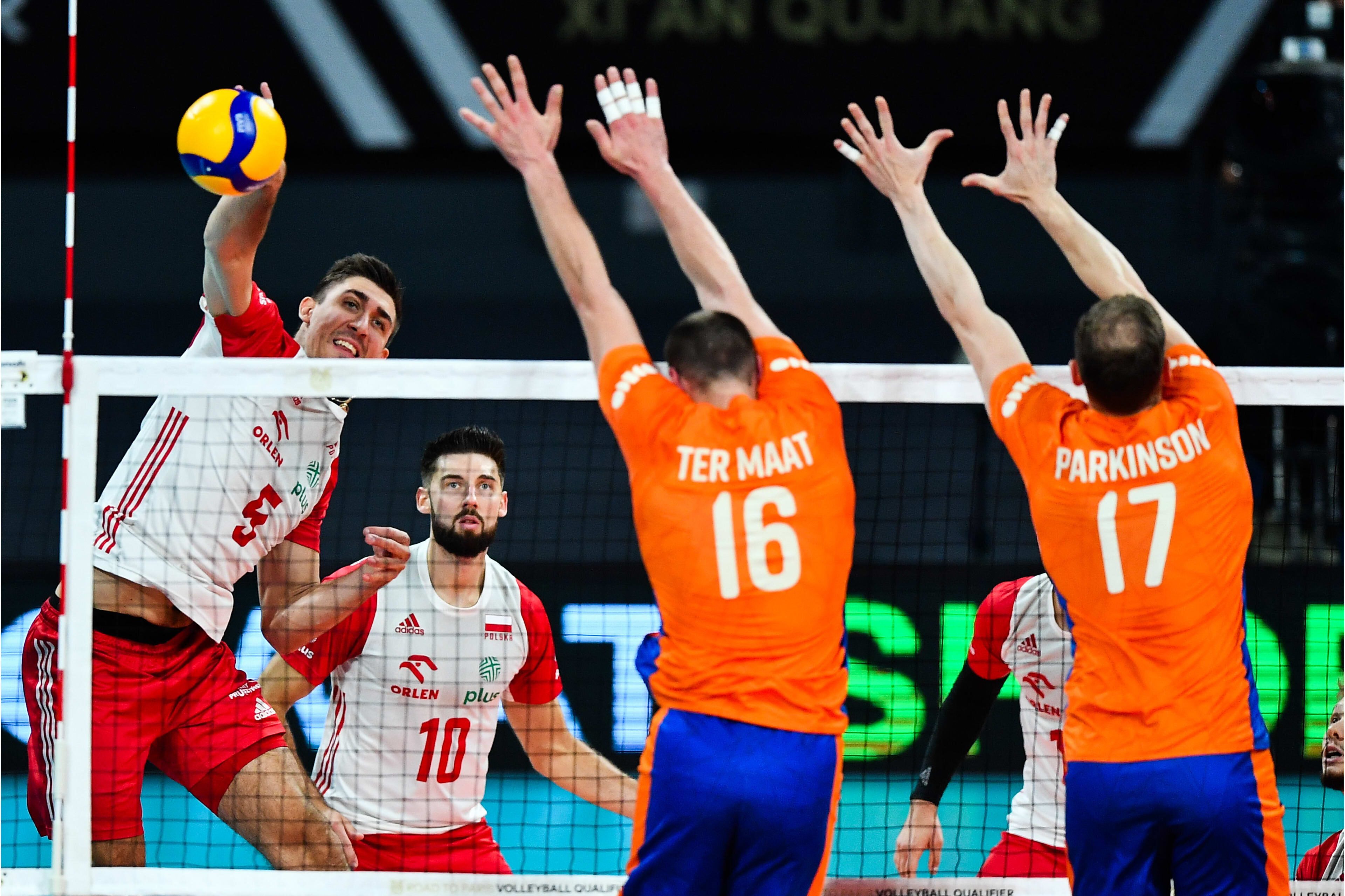 Het begin van set vier was helaas niet zoals gewenst en op 0-3 bracht Piazza Van Garderen voor Ter Maat. De Poolse voorsprong bleef lang staan, maar op de service van Bennie Tuinstra draaiden de Lange Mannen het om. Tuinstra vuurde de ene na de andere klap af en bracht Polen in de moeilijkheden. Jorna kwam er aanvallend mooi door en Keemink kon vooral Van Garderen en Parkinson feilloos vinden. Dat resulteerde in vier setpunten. Oranje kreeg de kansen om het af te maken, maar Polen wist ze te parreren en via hoge ballen van Leon in de set te blijven. De setpunten werden allemaal weggewerkt. Even later, op 28-29, sloeg Van Garderen de pipe-aanval buiten de lijnen waardoor Polen niet alleen de overwinning, maar ook officieel het ticket voor de Olympische Spelen kon vieren.