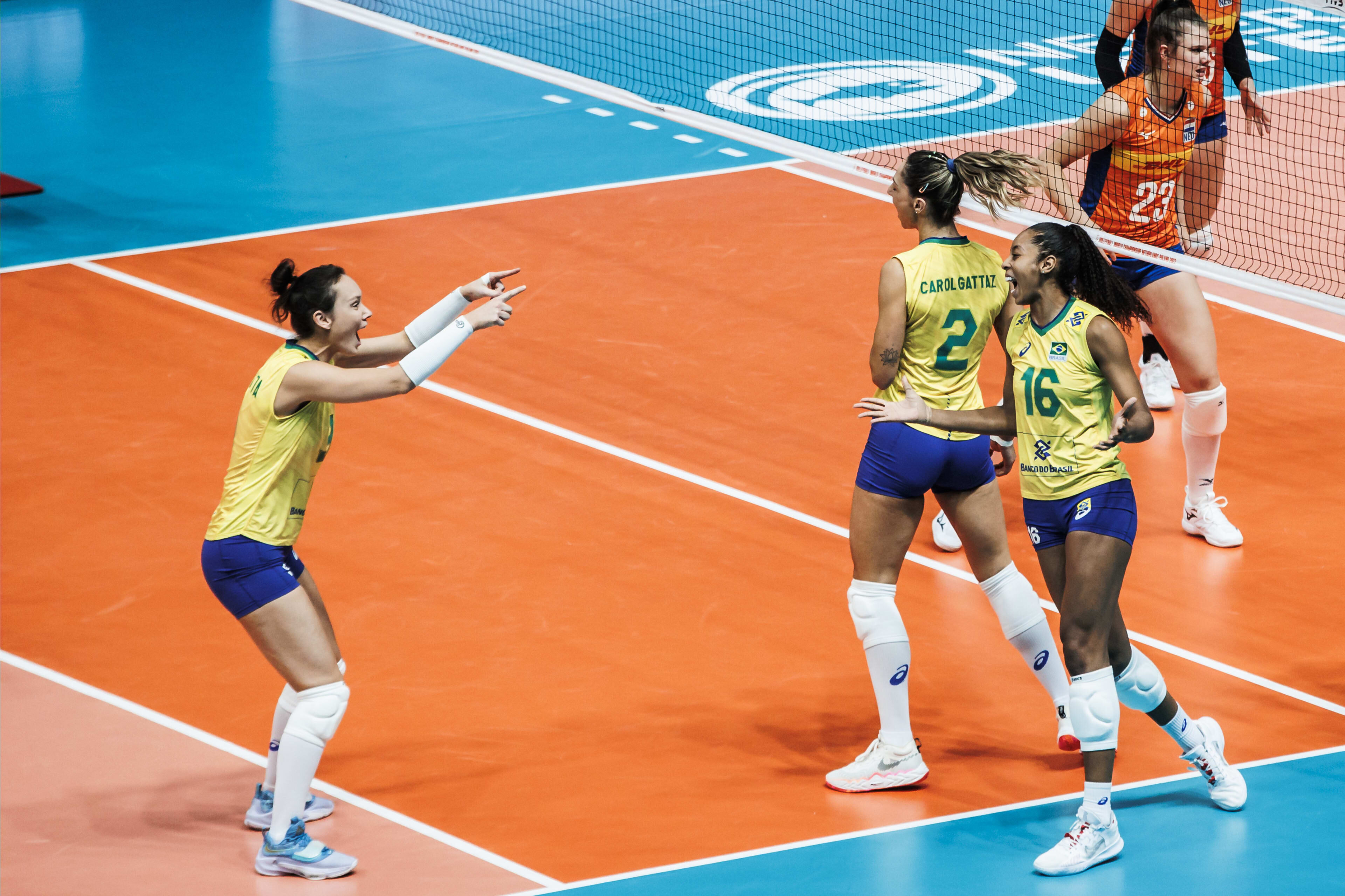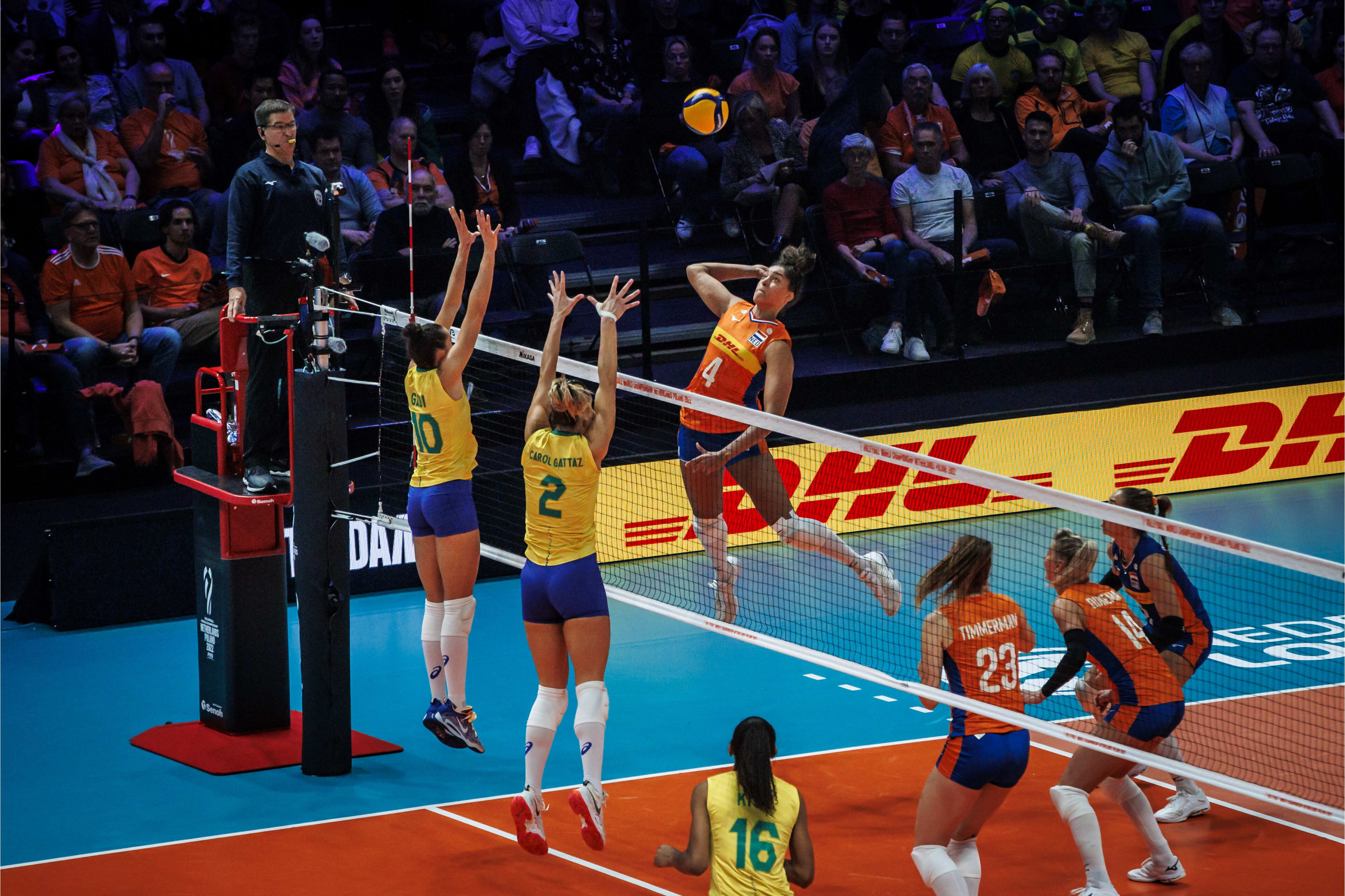 Oranje speelde donderdagavond een goede wedstrijd tegen China, ondanks dat er in vijf sets verloren werd, en mocht dus hopen op een stunt tegen Brazilië. In dezelfde opstelling als tegen China, onder meer met Elles Dambrink, begon Nederland in Ahoy tegen de nummer één van de wereld. Vooral in het begin deden de Volleybaldames niet onder voor Brazilië, dat wel steeds een paar puntjes voorsprong had. De invalbeurt van Laura Dijkema en Celeste Plak deed Nederland goed, maar daarna verloor het de aansluiting. Brazilië liep uit en won de eerste set toch nog met zes punten verschil (19-25).