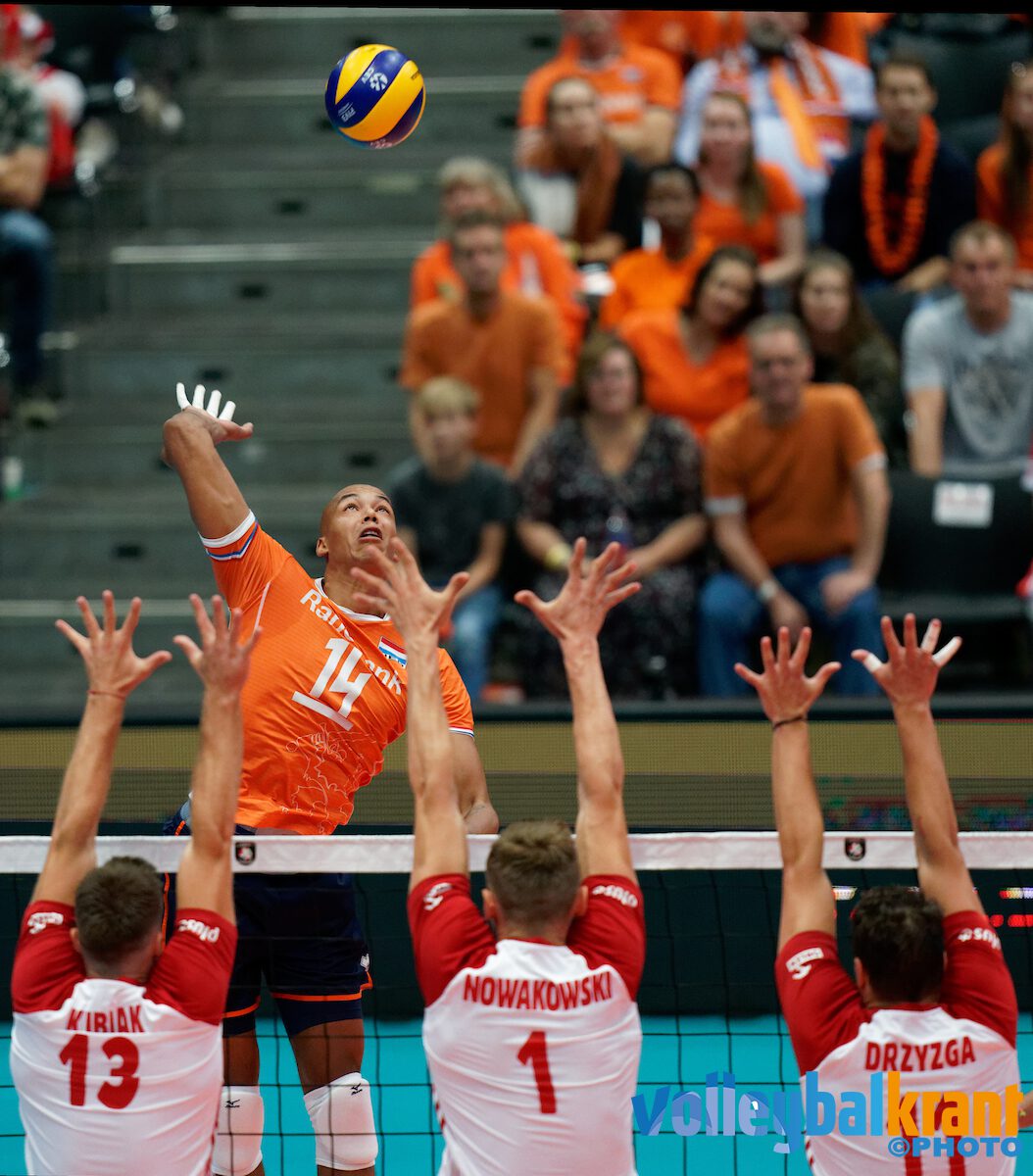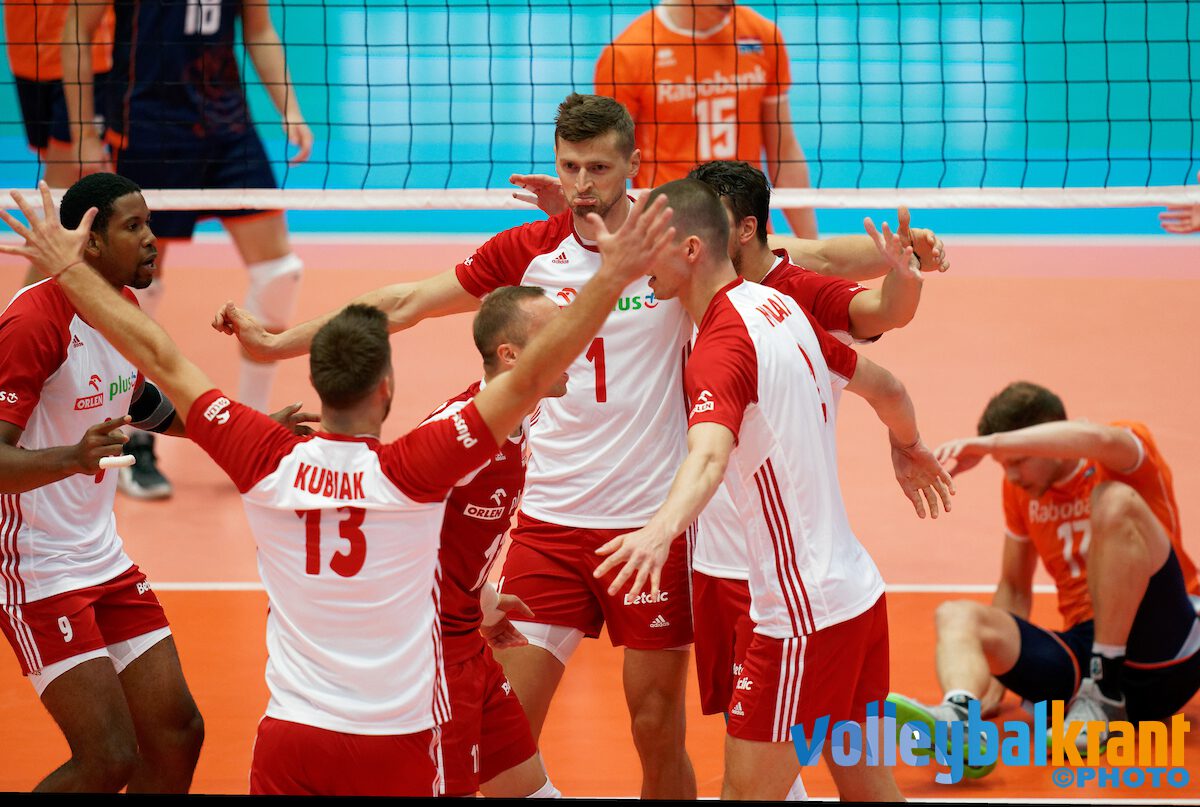 Vooraf zei de Nederlandse bondscoach Roberto Piazza al dat alle Poolse spelers razend sterk waren en alleen wanneer de Lange Mannen beter dan 110% zouden spelen ze konden gaan denken aan winst. Nederland startte met Maarten van Garderen, Thijs ter Horst, Fabian Plak, Nimir Abdel-Aziz, Gijs van Solkema en Michael Parkinson en libero’s Just Dronkers en Robbert Andringa. Polen startte overdonderend, nam resoluut de leiding en stond deze niet meer af. Steeds waren er die drie punten voorsprong, om aan het eind uit te lopen naar 19-25. De tweede set bood hetzelfde spelbeeld met verlies in 18-25. In de derde set nam Nederland een voorsprong, veel lukte, en met weinig foute servicebeurten was het opeens 12-9. Toen Polen echter aanzette met uitblinkers Wilfred Leon, de tot Pool genaturaliseerde Cubaan en Meteusz Bieniek was het opeens 12-15. Oranje kwam er niet meer aan te pas: 19-25. Invalbeurten waren er voor Wessel Keemink, Gijs Jorna, Sjoerd Hogendoorn en Luuc van der Ent.