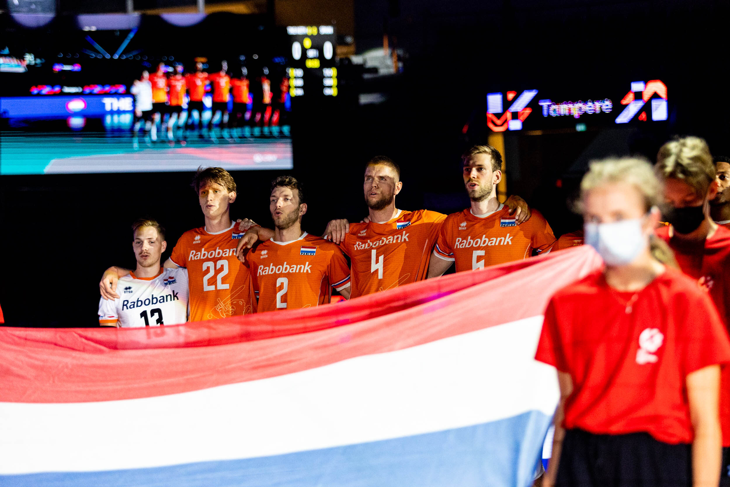 Roberto Piazza koos in het openingsduel van het EK voor het volgende team: Wessel Keemink, Nimir Abdelaziz, Robbert Andringa en Bennie Tuinstra, Fabian Plak en Luuc van der Ent en Just Dronkers.