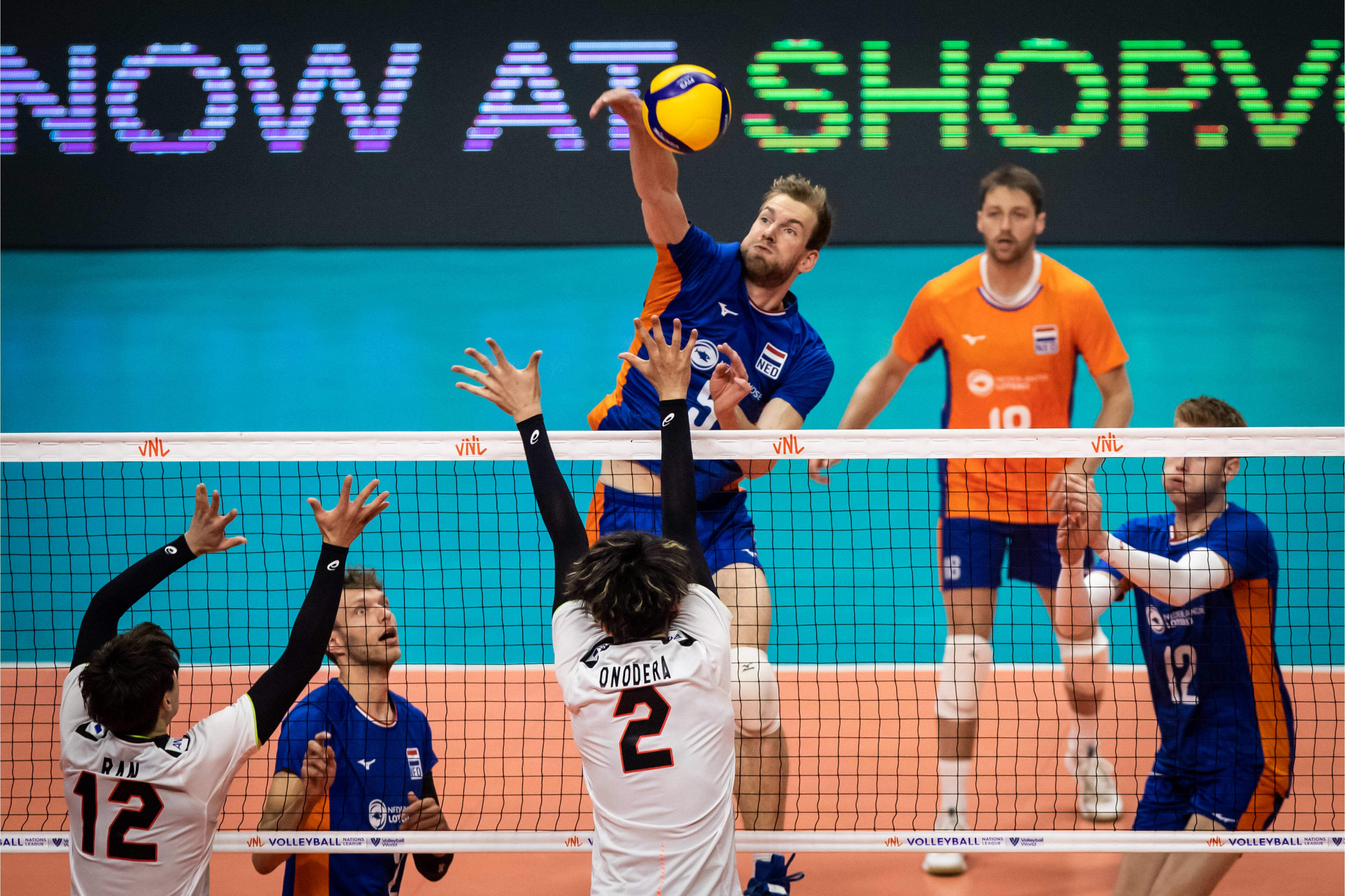 Het goede spel uit set één werd doorgetrokken in set twee. Al snel kwam Oranje op een ruime voorsprong en na een killblok van Keemink gingen de mannen van Piazza met een 12-5 voorsprong de technische time-out in. Geen vuiltje aan de lucht zou je denken, maar de taaie Japanse ploeg begon puntje voor puntje de achterstand te verkleinen. Vervolgens begon Oranje ook zelf kansen in de rally te missen. Gijs Jorna kwam binnen de lijnen voor Van Garderen en na een score van Tuinstra was er nog altijd een 19-14 voorsprong. Maar op het einde van de set ging het goed mis. Op 23-19 voor Nederland kwam de Japanse passer-loper Ran Takahashi aan de opslag. Oranje kwam niet uit de rotatie en na een blok op Nimir kwam de dubbele wissel met Gijs van Solkema en Thijs ter Horst in het veld. Dit had niet het gewenste resultaat en Japan bracht de achterstand terug tot één punt. Een ace van Takahashi gevolgd door een killblok bracht Japan op setpoint. Deze werd in eerste instantie niet verzilverd, maar een ace van middenman Go Murayama zorge twee punten later alsnog voor setwinst voor Japan (24-26).