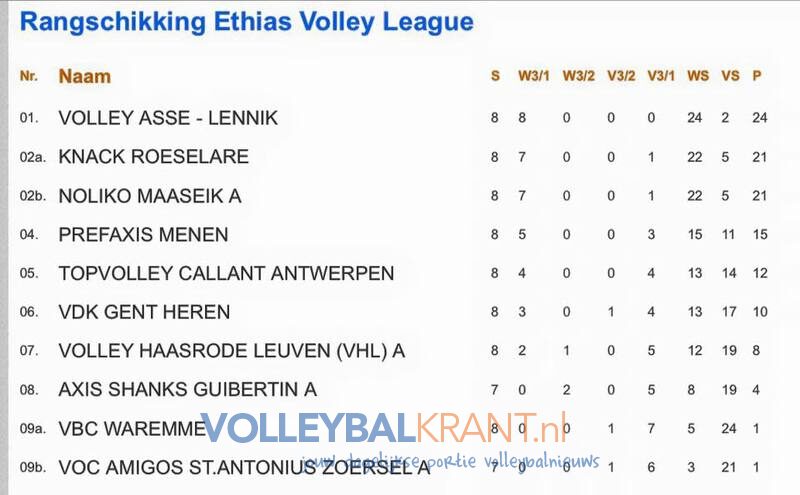 Asse-Lennik stond lange tijd samen met Roeselare aan kop van het Belgische klassement, maar in een onderlinge strijd schudde de ploeg dit weekend concurrent Roeselare met 3-1 van zich af. Lennik staat nu met het maximaal aantal punten alleen aan kop. Maaseik profiteerde van het verlies van Roeselare in de topper en kwam dankzij de volle zege op Menen weer op gelijke hoogte met de ploeg van Joppe Paulides.