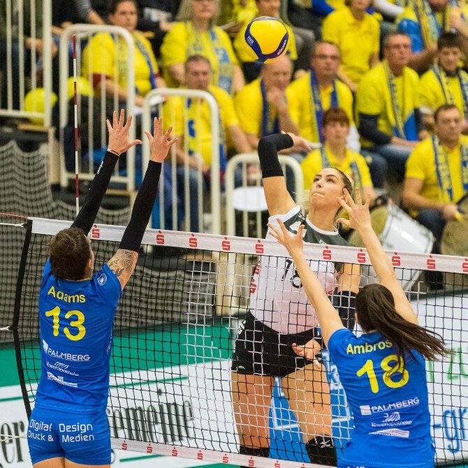 USC Münster had ook weinig moeite bij Suhl. Met 17-25, 20-25 en 21-25 werd de terugreis aanvaard. Hester Jasper werd bij Suhl gekozen tot meest waardevolle speelster. Ze speelde de hele wedstrijd. Anniek Siebring kreeg in alle drie de sets een invalbeurt. Bij Münster speelde Demi Korevaar de hele wedstrijd. Spelverdeelster Sarah van Aalen werd aan het eind van de 2e en 3e set met een dubbele wissel ingebracht.