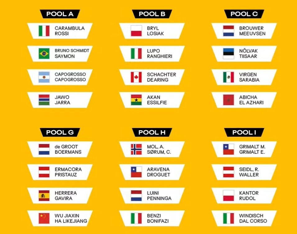 Boermans/De Groot voert Poule D aan, maar hebben op papier wat sterkere teams naast zich. Ermacora/Pristauz (AUT) en Herrera/Gavira (ESP) zijn ervaren duo's die al jaren meedraaien in de World Tour. Wu Jiaxin/Ha Likejian (CHN) is het zwakste duo. De hoop is dat Yorick de Groot op tijd fit is voor het WK, nadat hij de afgelopen Elite 16 mistte en ook aankomende week in Letland niet kan spelen.