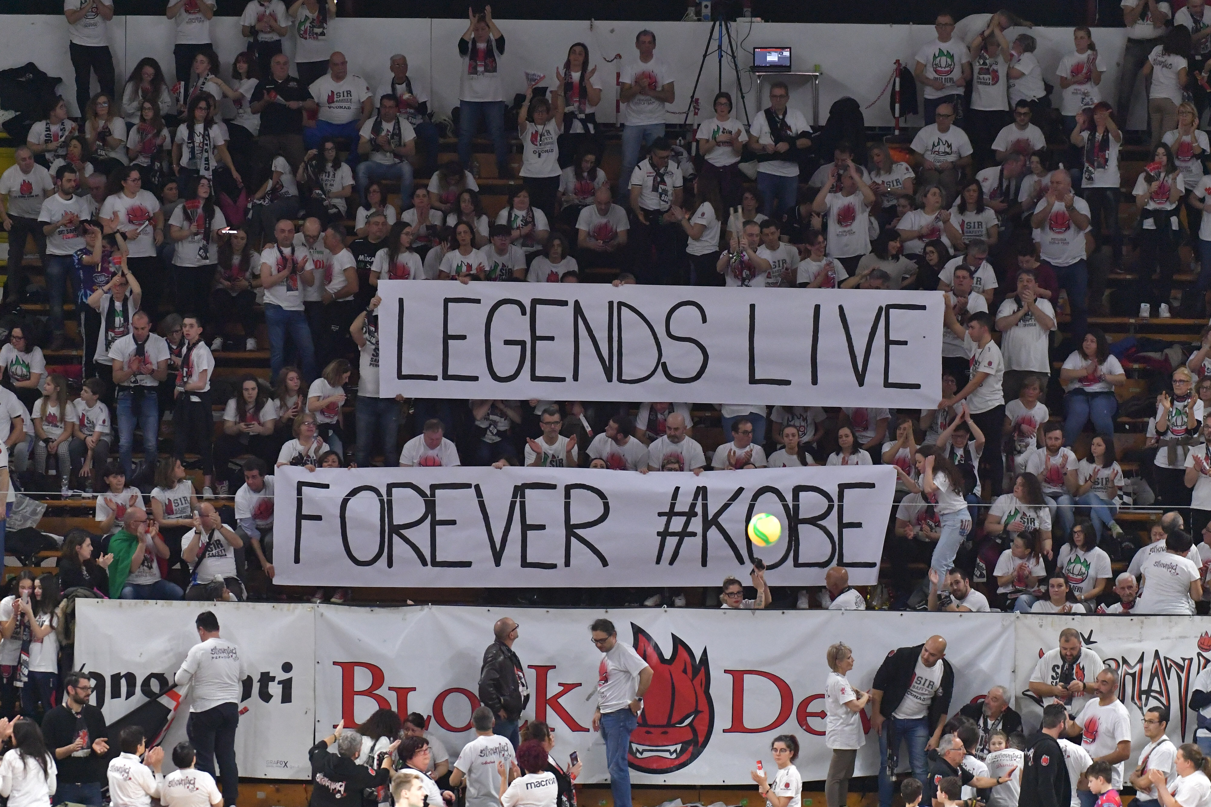 Op de tribune van Pala Barton was een spandoek te lezen met daarop de tekst: Legends live forever #Kobe. Daarmee stonden de club en fans van Perugia stil bij het overlijden van de basketballer Kobe Bryant. (Zie foto boven).