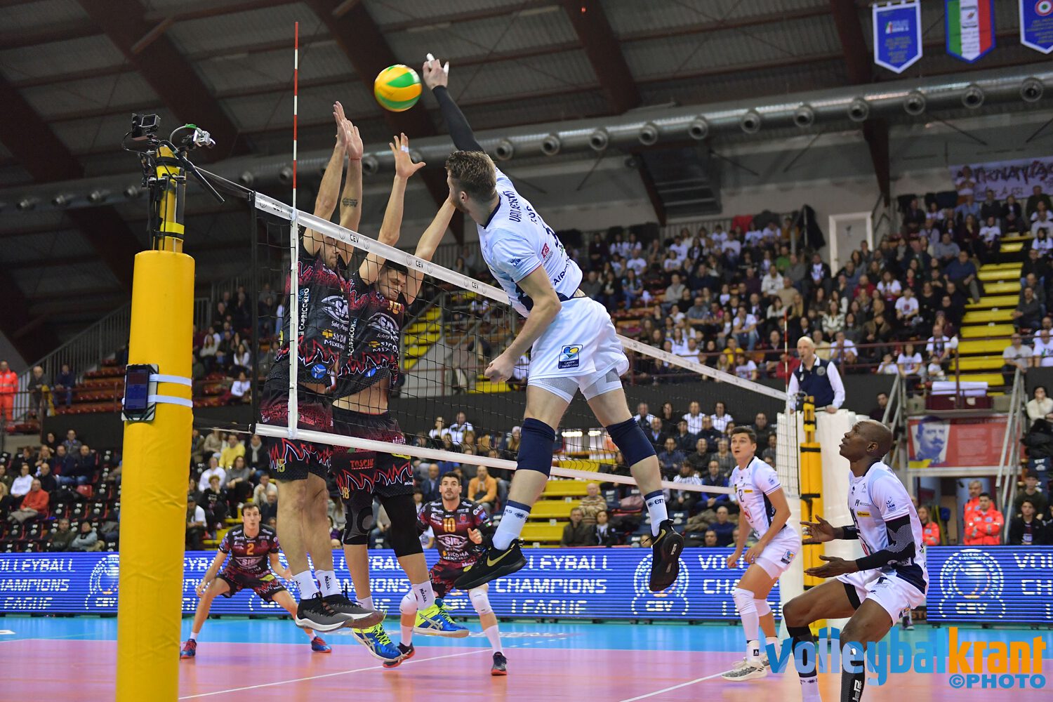 In drie sets maakte de Italiaanse kampioen duidelijk dat de Champions League ook dit jaar een doel is. De setstanden waren 25-20, 25-20, 25-19. Floris van Rekom kwam tot zes punten, een aanvalspercentage van 55 %. Sjoerd Hoogendoorn kwam bij 21-16 in de derde set ook binnen de lijnen, maar mede door vier foutservices van Tours kon hij niet tot aanvallen komen.