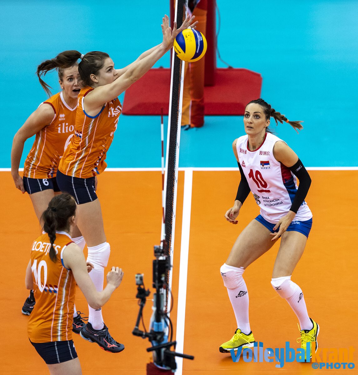 Met het winnen van een fantastische rally in de beginfase van de eerste set, indrukwekkend aanvalsspel en slimme doortikballen van spelverdeelster Laura Dijkema werd Servië helemaal zoek gespeeld. Aan de hand van Sloetjes liep Oranje uit van 9-5 en 13-8 naar 20-14. De ploeg was niet te stuiten en bereikte met de 25-16 het eerste doel, plaatsing voor de volgende ronde.