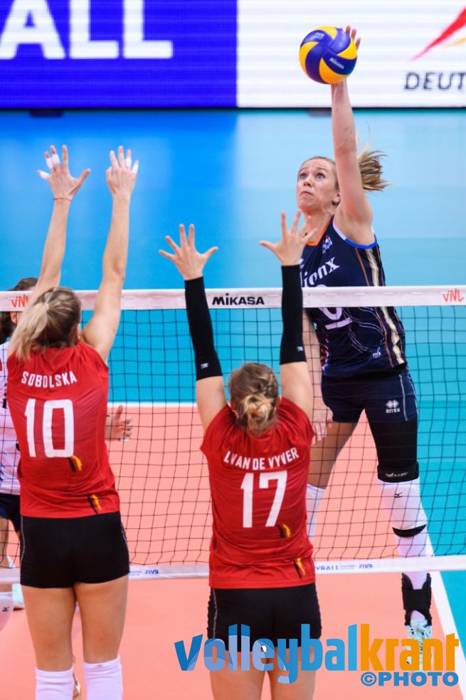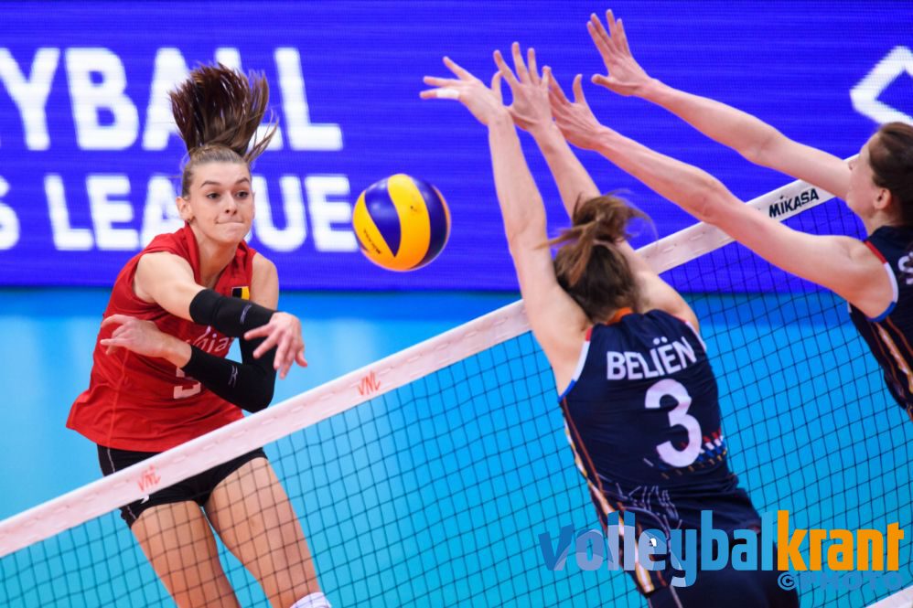 Met Plak op de plek van Daalderop had Nederland in de beginfase van set drie opnieuw moeite het ritme te vinden. Een achterstand van vier à vijf punten werd telkens wel een beetje ingelopen door de Nederlandse ploeg, om vervolgens België weer verder uit te laten lopen. De matige servicepass zorgde er aan de kant van Oranje voor dat het aanvalsspel voorspelbaar werd. Voor België lukte daarentegen alles en bezorgde het buurland de setwinst: 17-25.