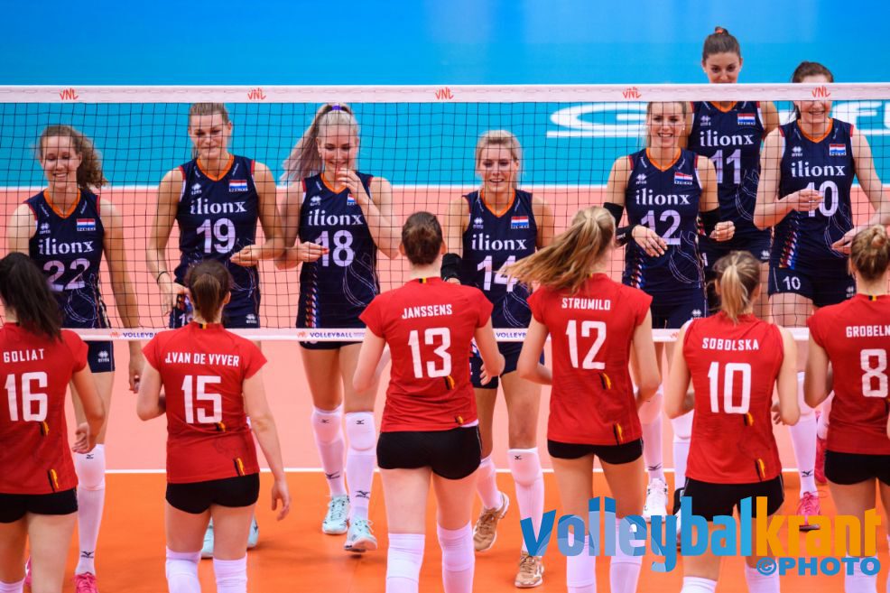 Morrison koos voor een basis met Dijkema, Sloetjes, Balkestein, Daalderop, Beliën, Lohuis en Schoot. Nederland speelde wisselend in de eerste set, waarbij het voor veel van de speelsters de eerste wedstrijdminuten bij Oranje waren deze zomer. Twee keer leverde Nederland een voorsprong in tegen België, dat steeds net niet langszij wist te komen Een netfout bezorgde Nederland wel het eerste setpoint op 24-21. Lonneke Sloetjes zorgde er met haar zesde punt, een aanval via de blokkering, voor dat het tweede setpoint werd benut (25-22).